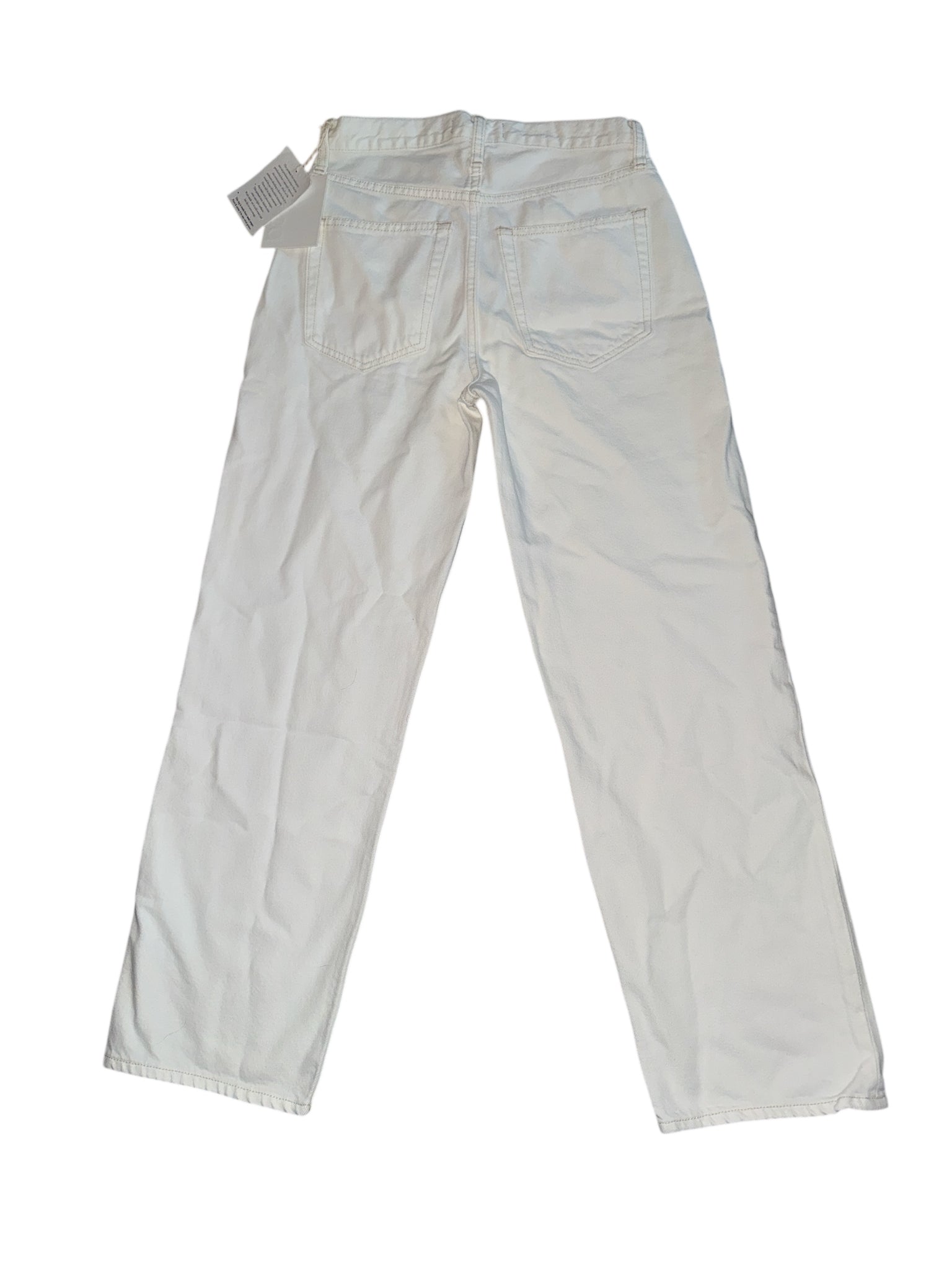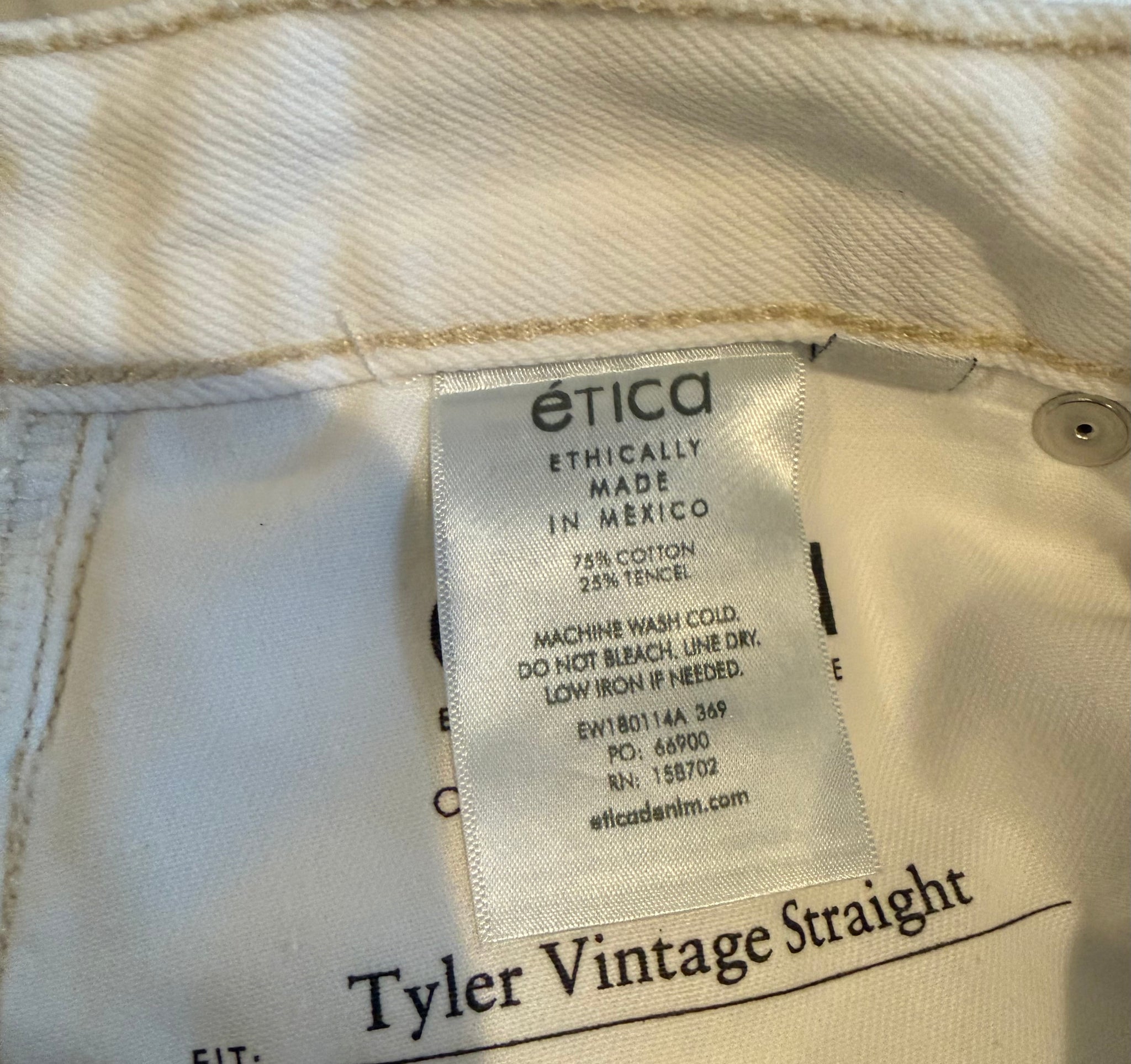Etica ethically made, certified organic, women’s vintage white Tyler vintage high rise straight leg ankle jeans, button-fly closure, size 25.