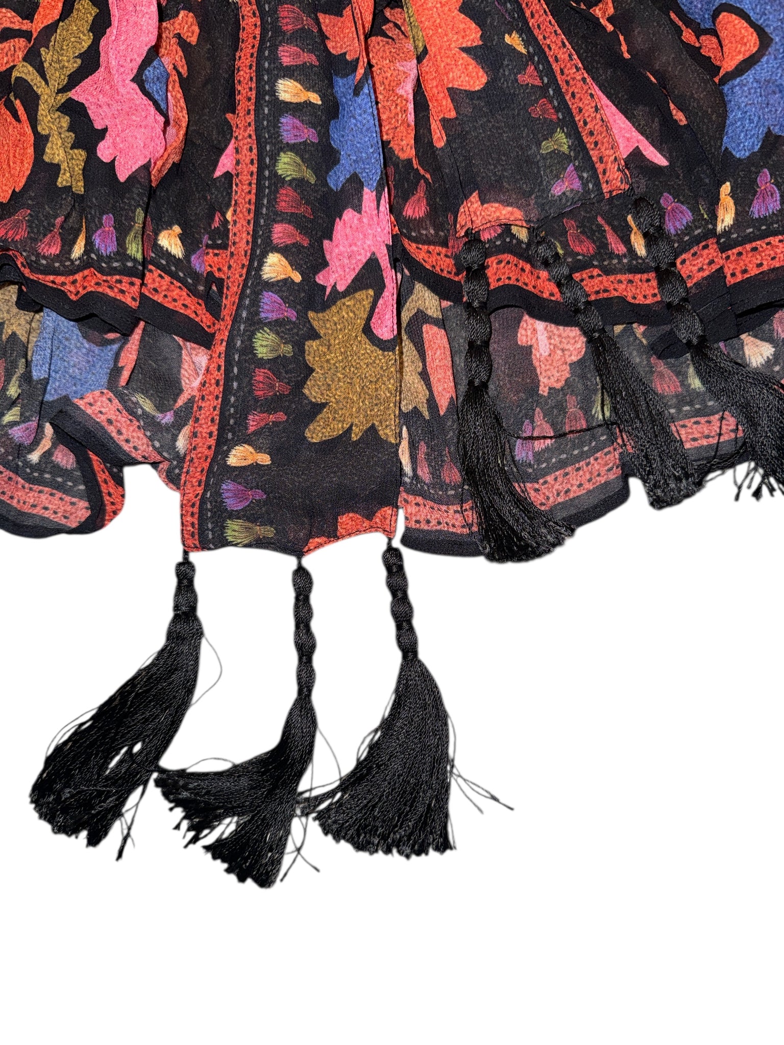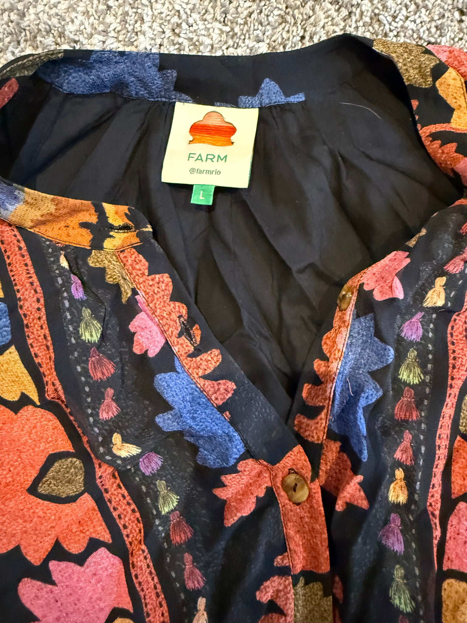 Farm Rio women’s colorful tapestry printed long sleeve mini dress, tie belt with black fringes, size L.