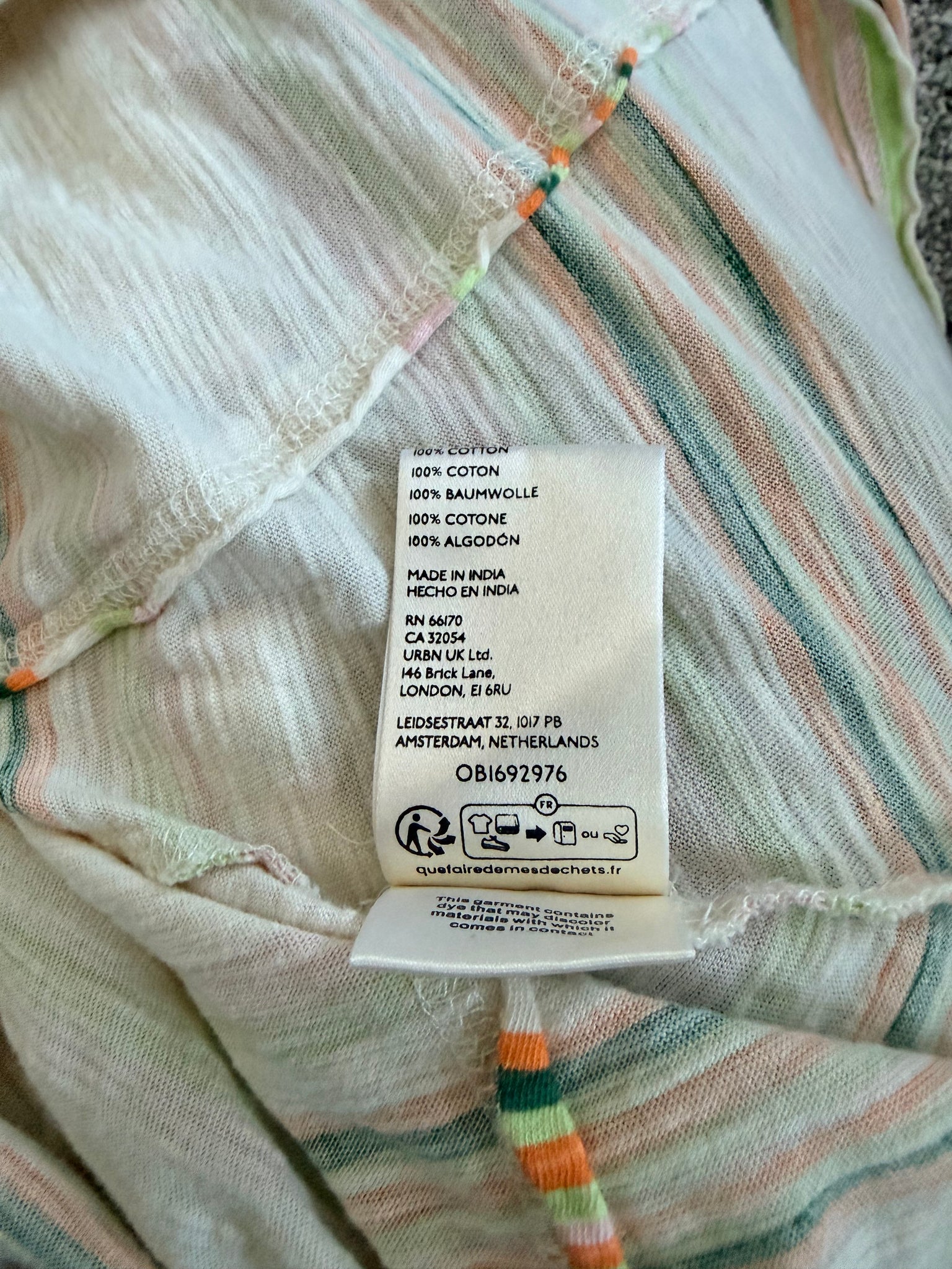 Free People women’s boxy Beach Dreamin tee in ivory with multicolor stripes and white crochet knit mesh by neckline, size XS.