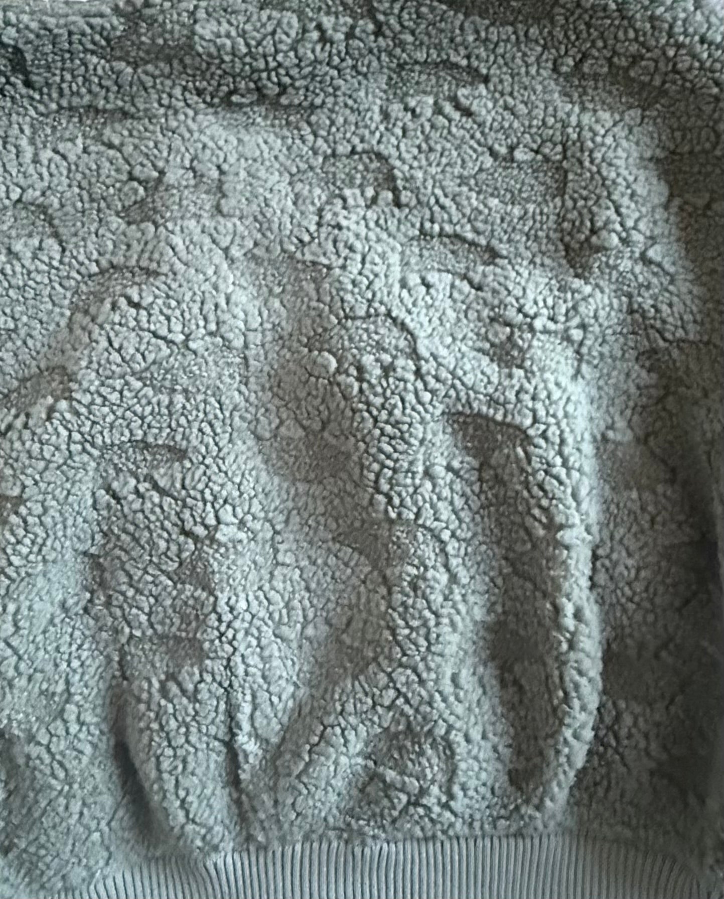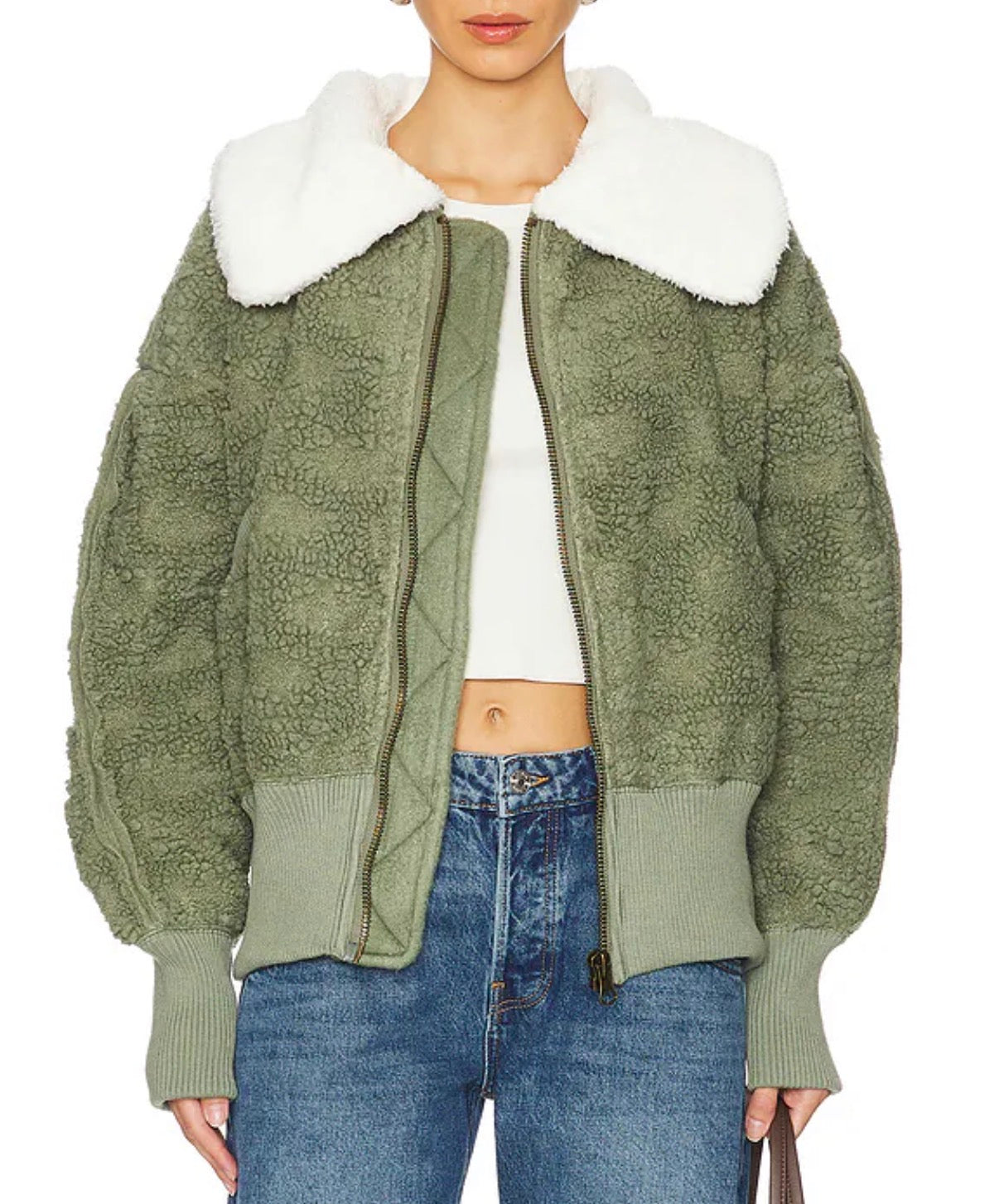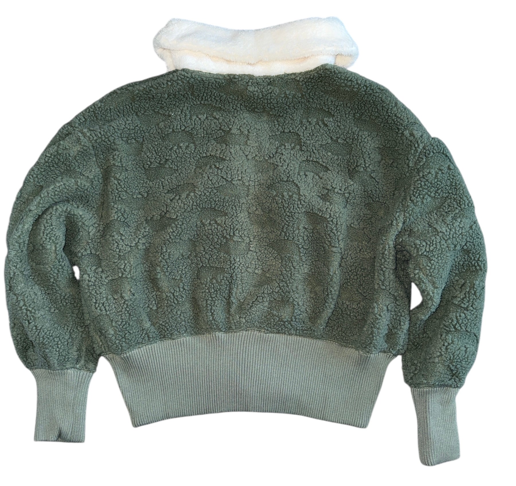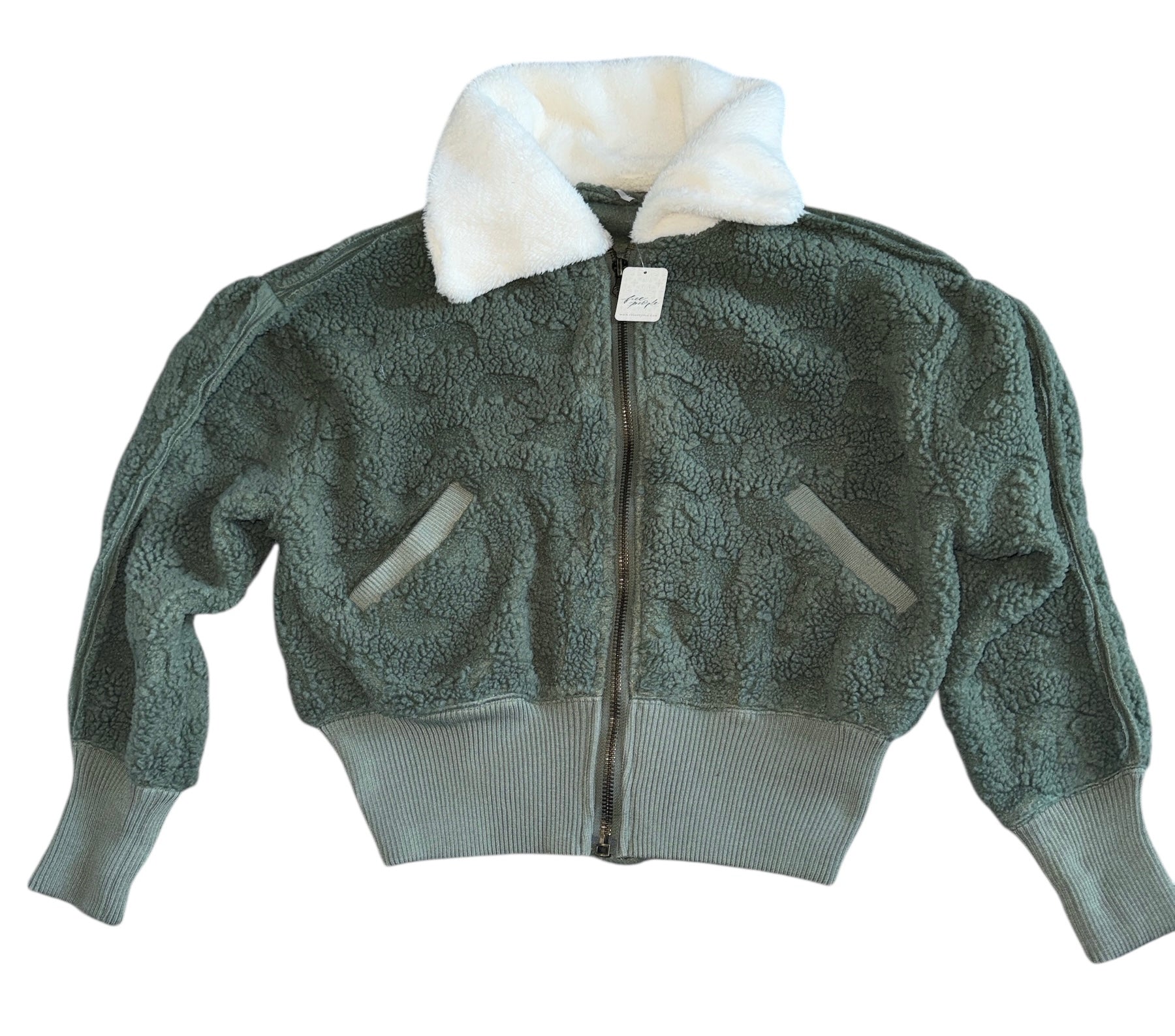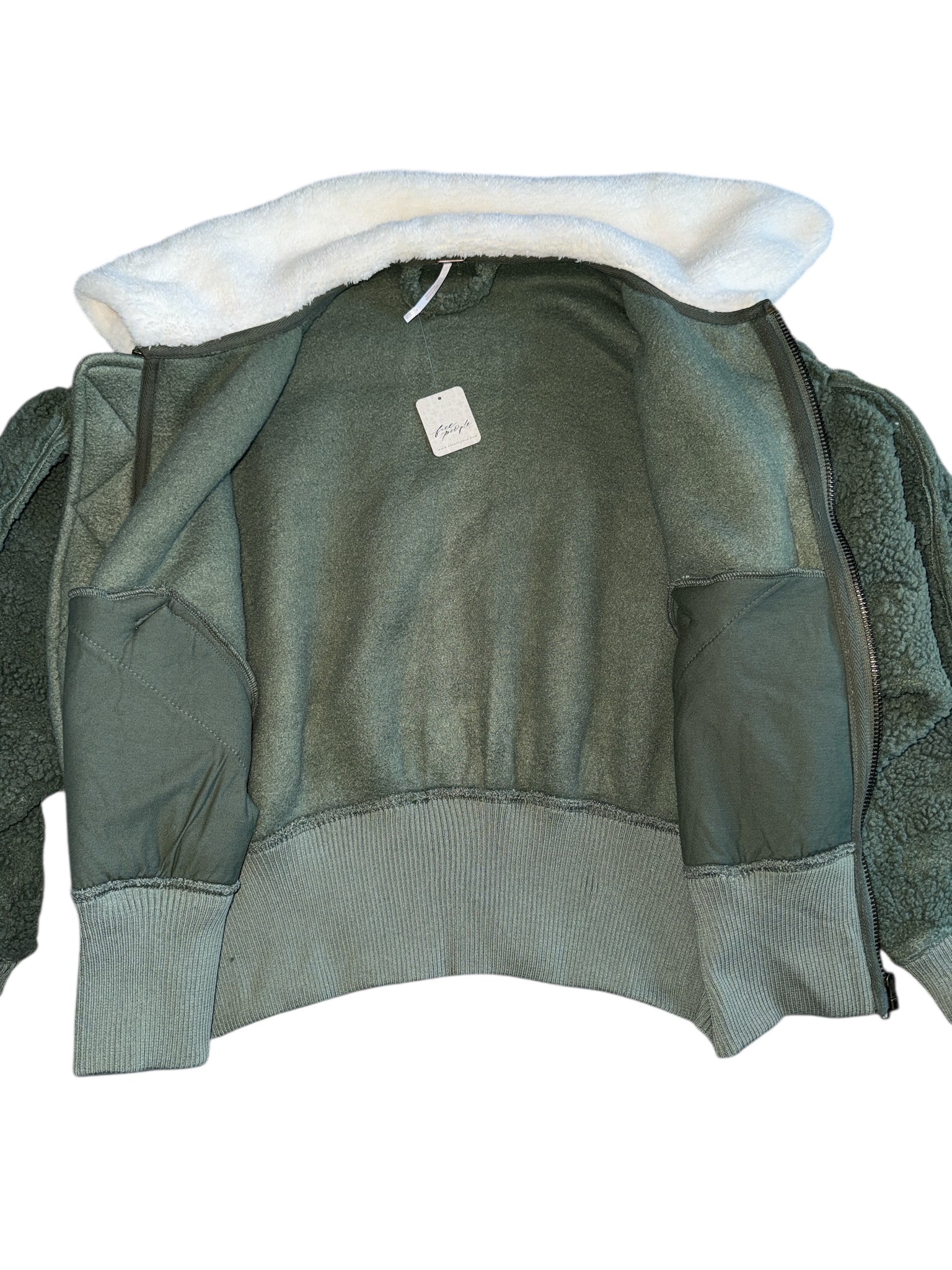 Free People women’s super soft and warm Cozy Up faux fur Sherpa jacket in crystal kelp combo (sage green with ivory collar), zip closure, and wide ribbed hem and cuffs, size XS.