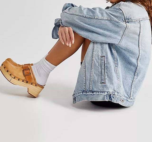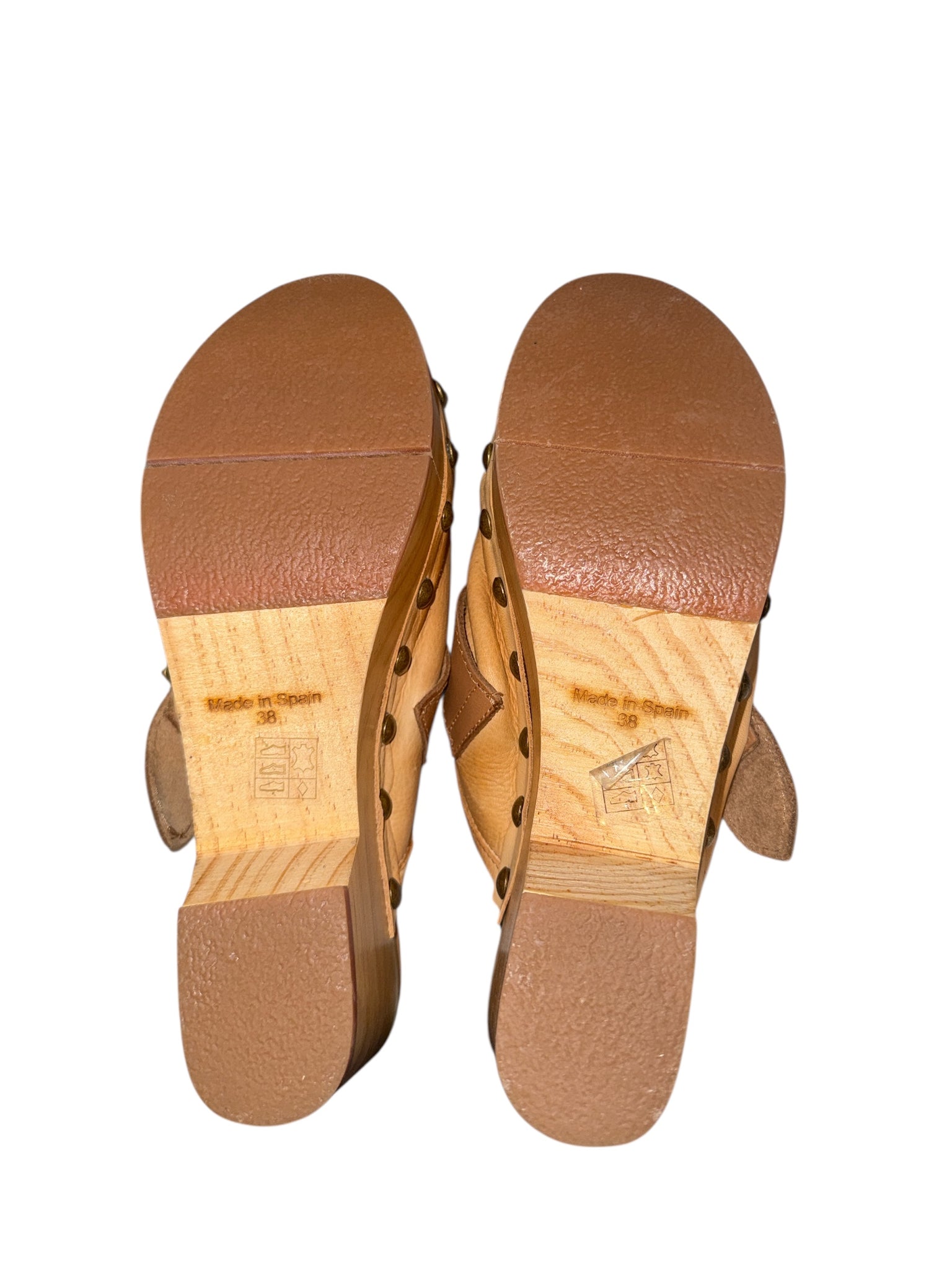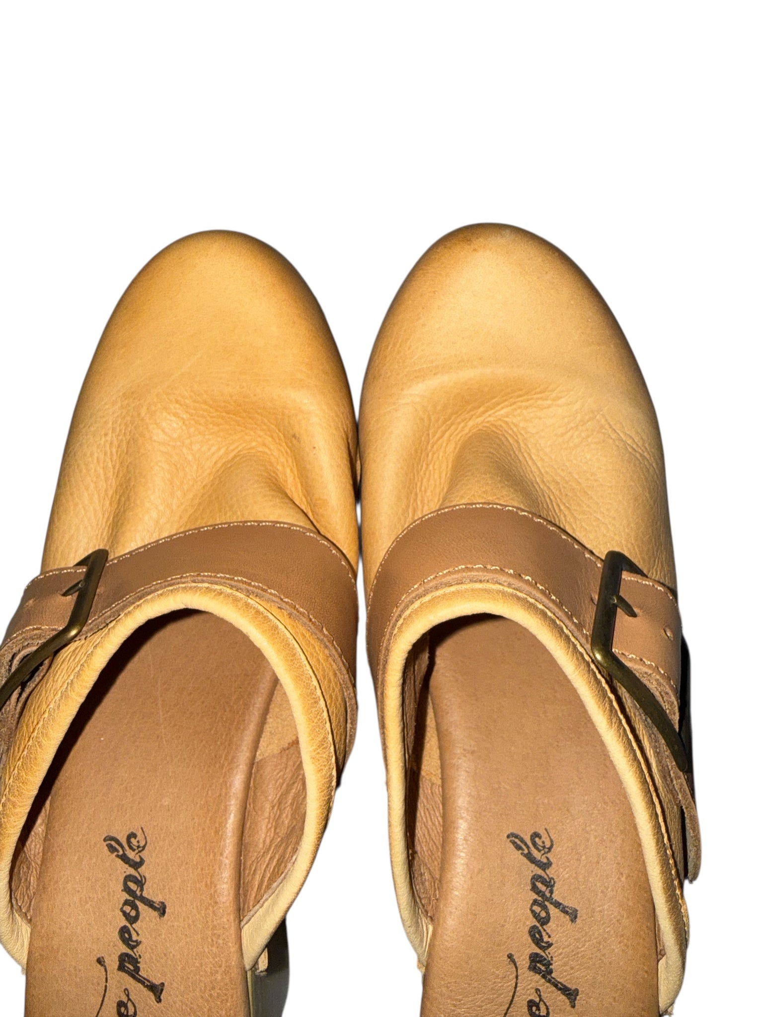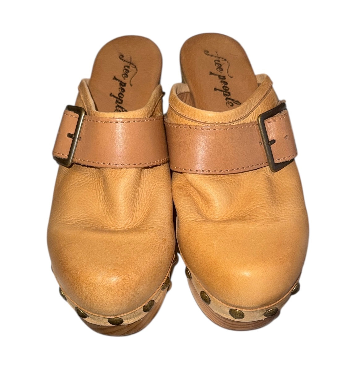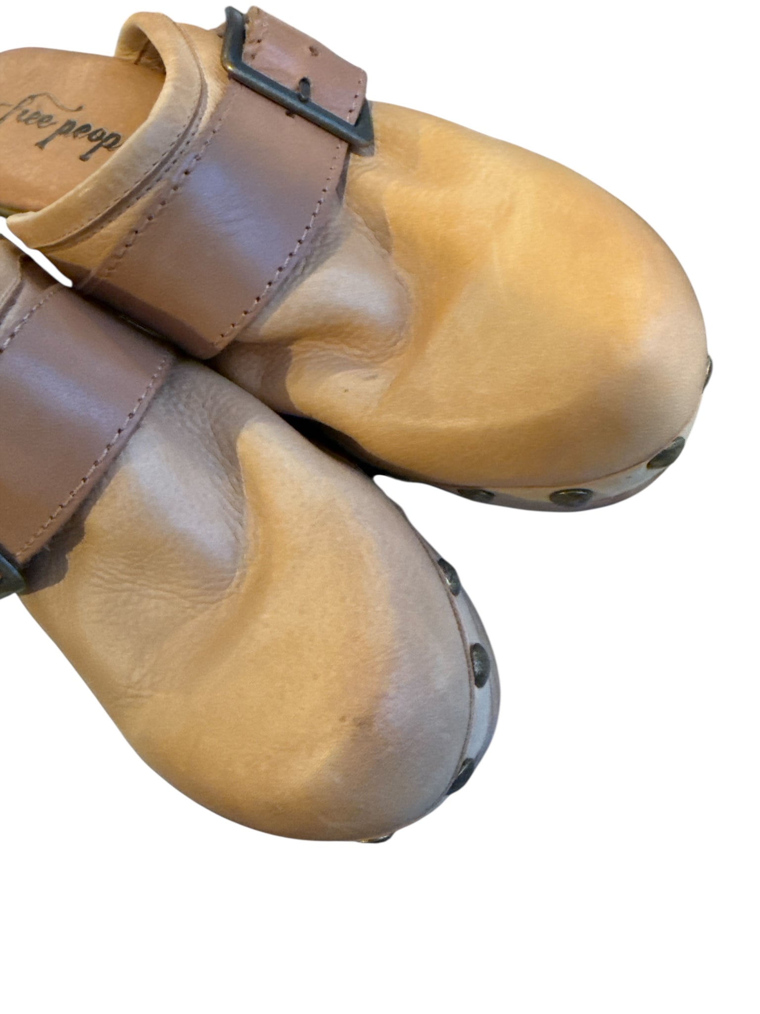Free People women’s Spanish made Culver City wooden slip on leather clogs with buckles, studs, and a split-wood platform for extra support and flexibility in camel, size 38(7.5 US).
