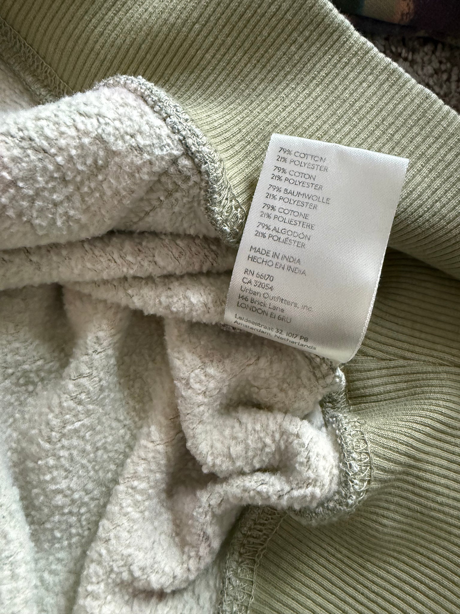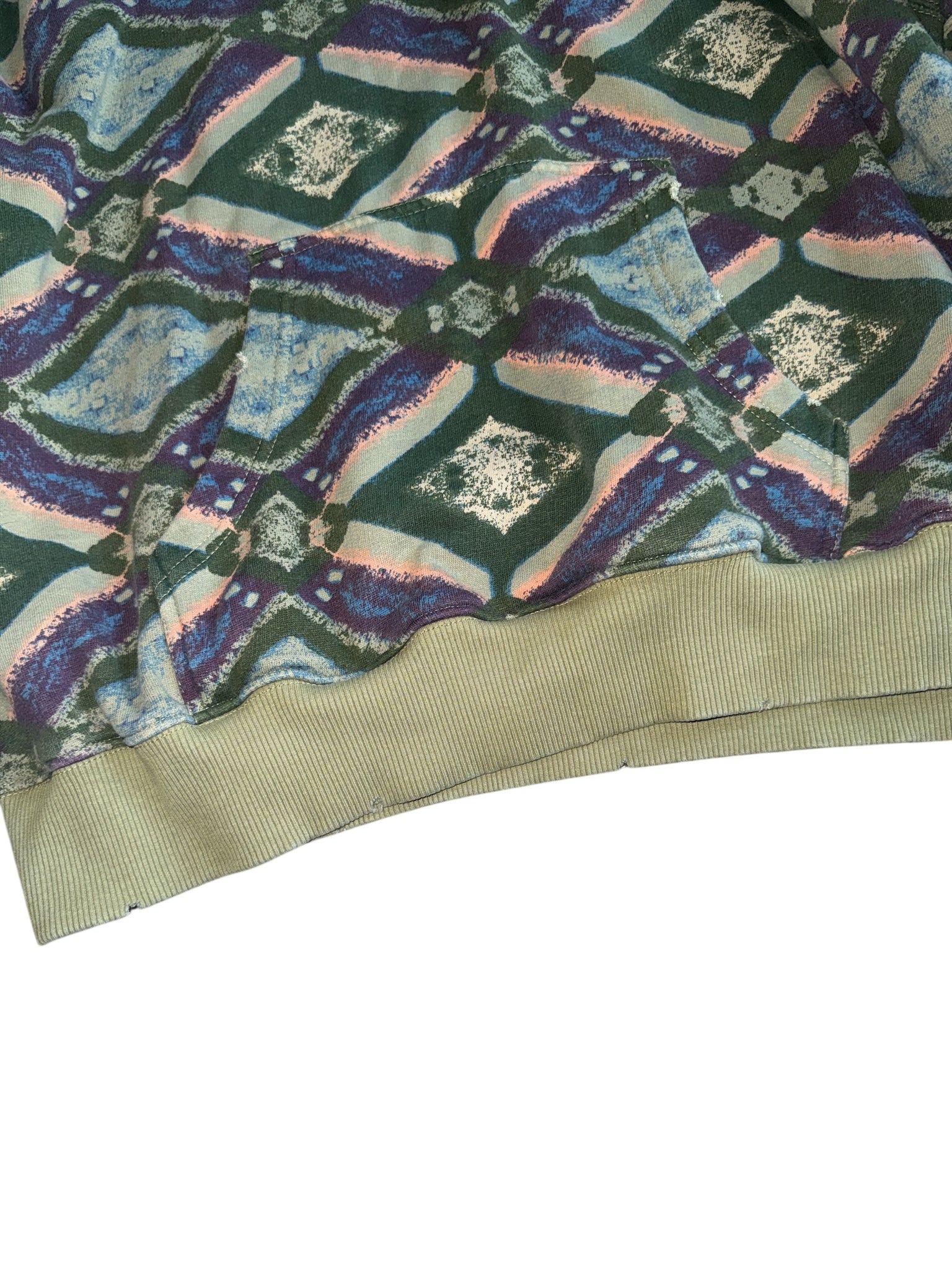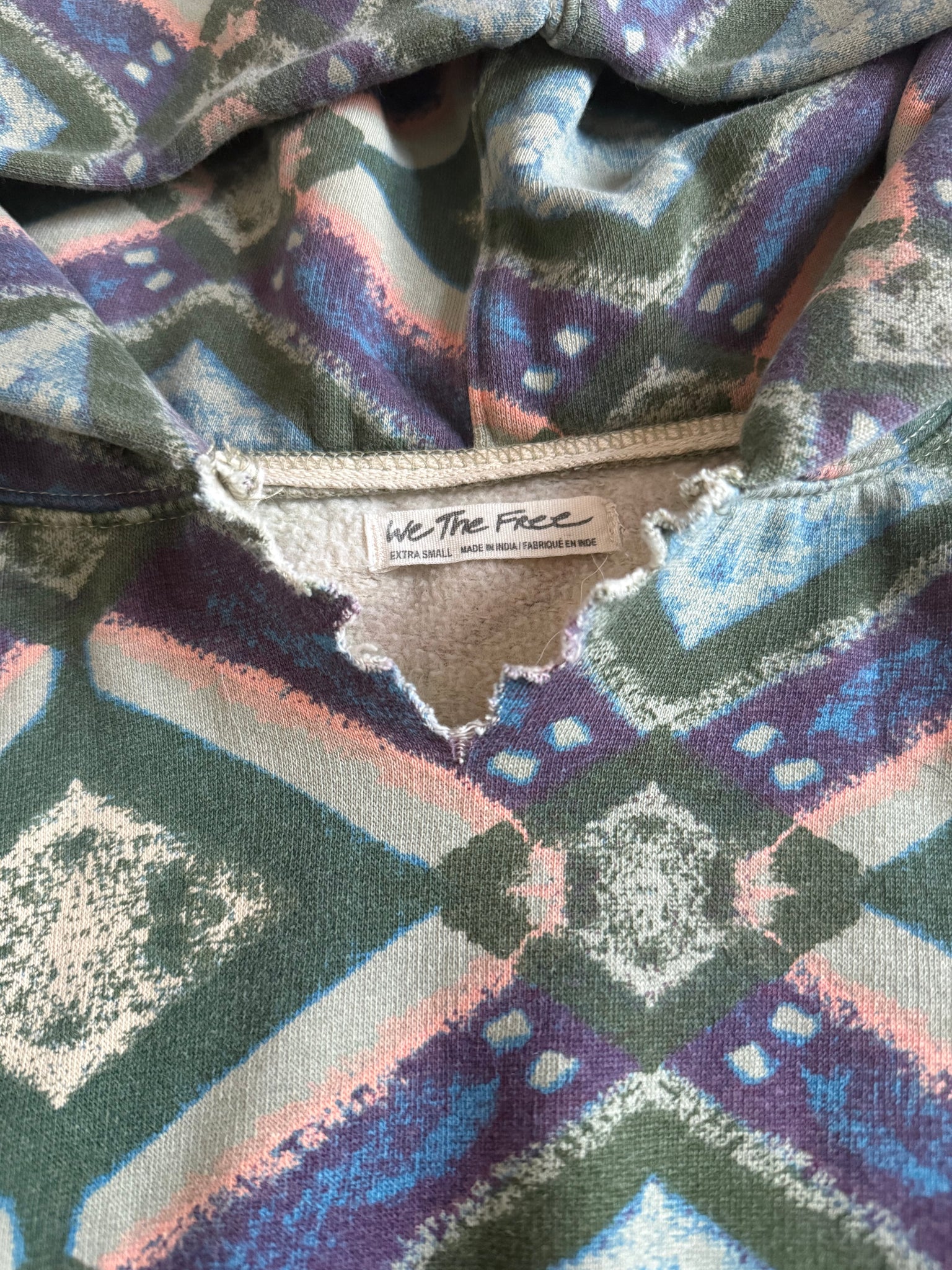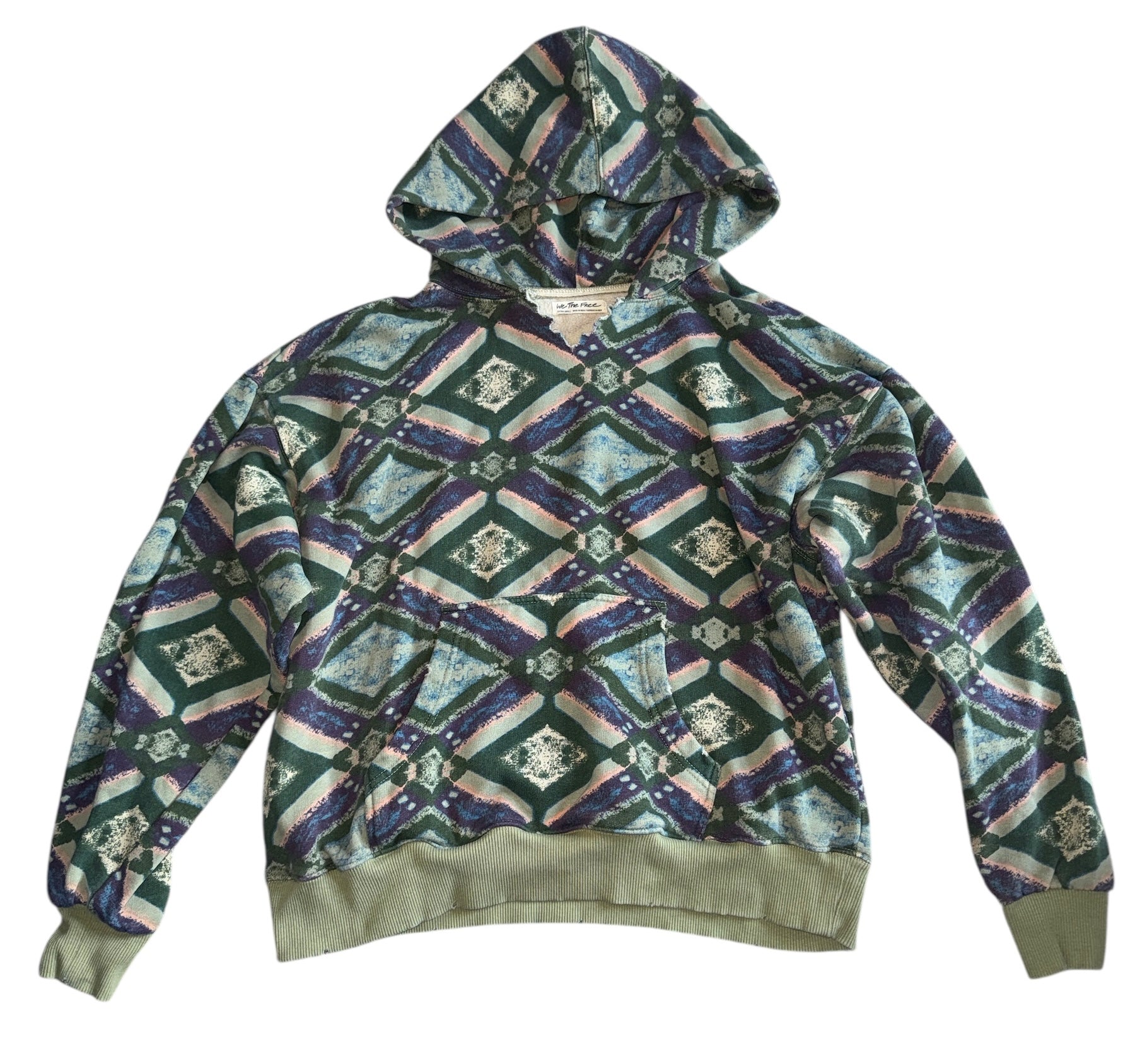 Free People women’s soft fleece lined heavyweight It’s a Vibe green combo geometric pattern hoodie sweatshirt with distressed hem, size XS.