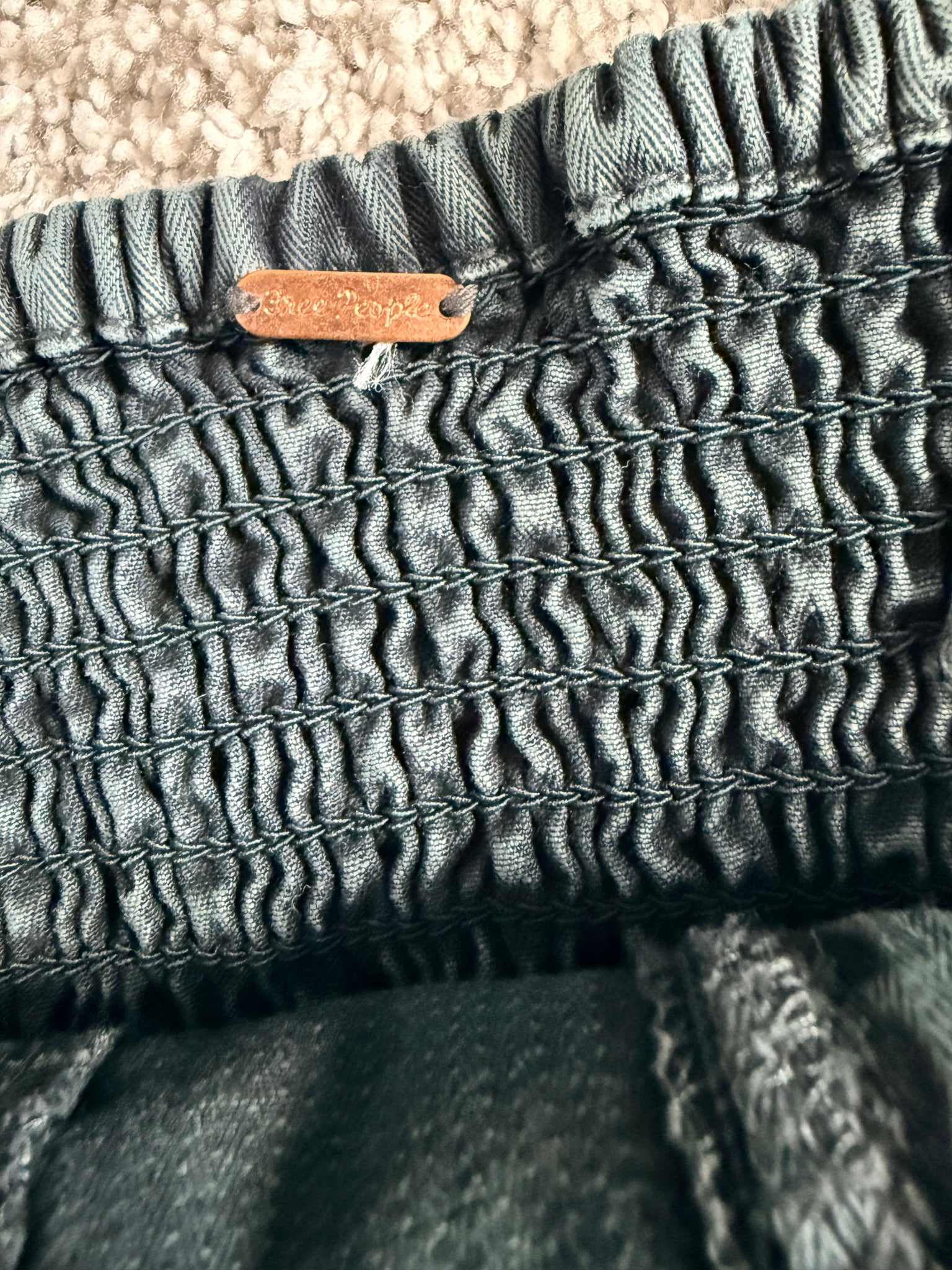 Free People women’s soft and stretchy Lucky Day one piece sleeveless jumpsuit with smocked stretchy back, adjustable straps, pockets, ankle slits, and zip up front in magic forest green size XS (jumpsuit is missing size please read measurements).
