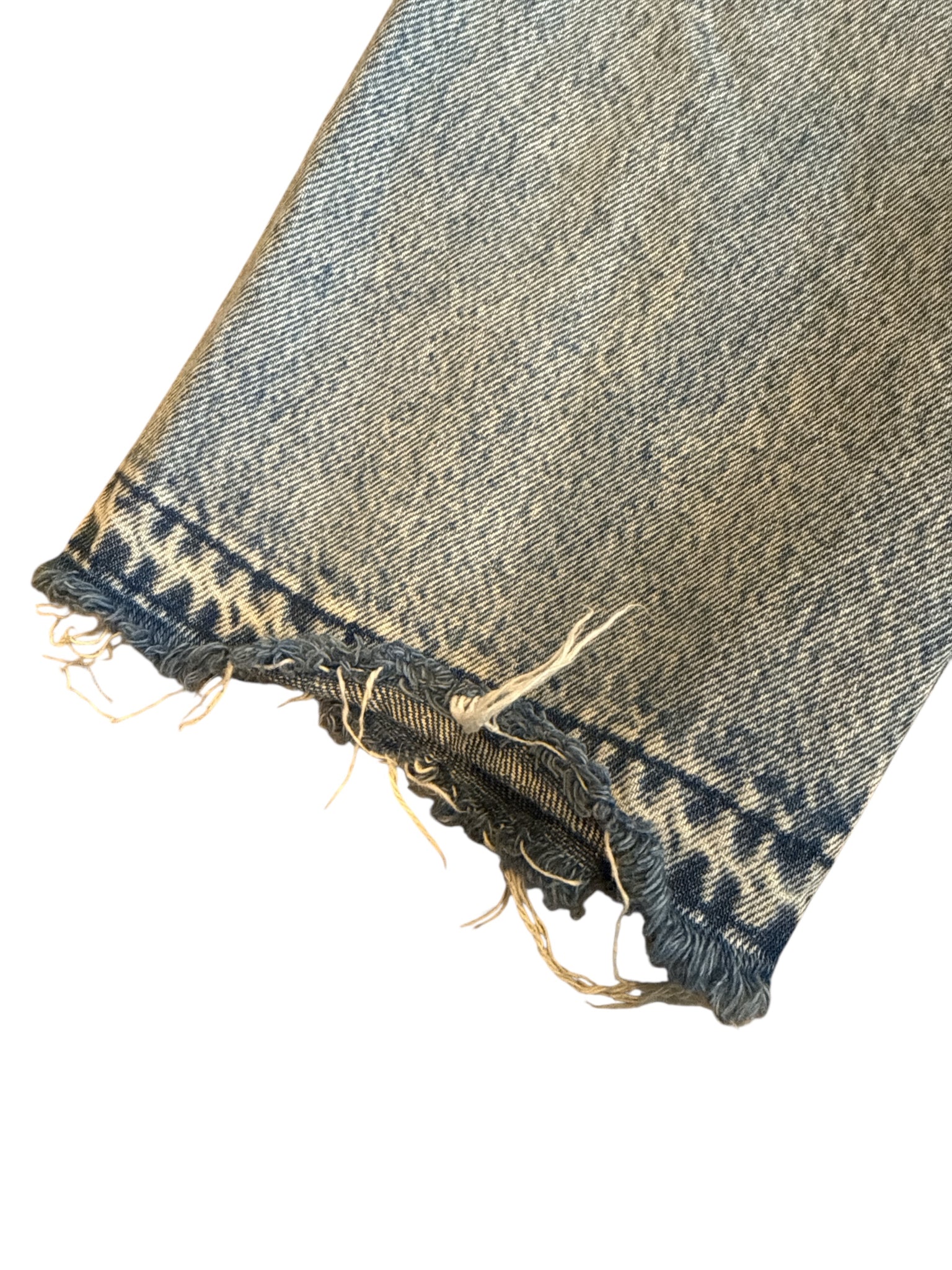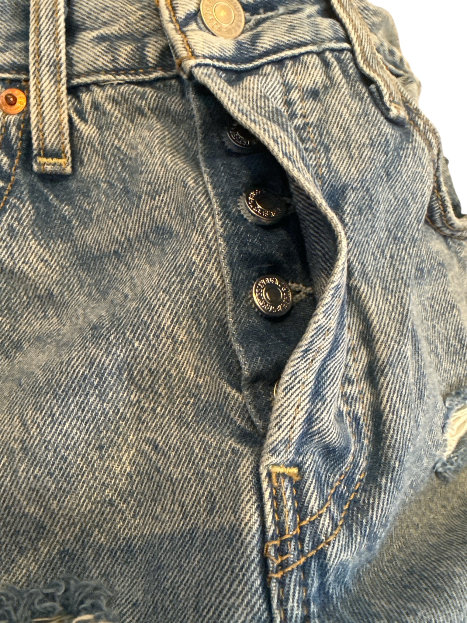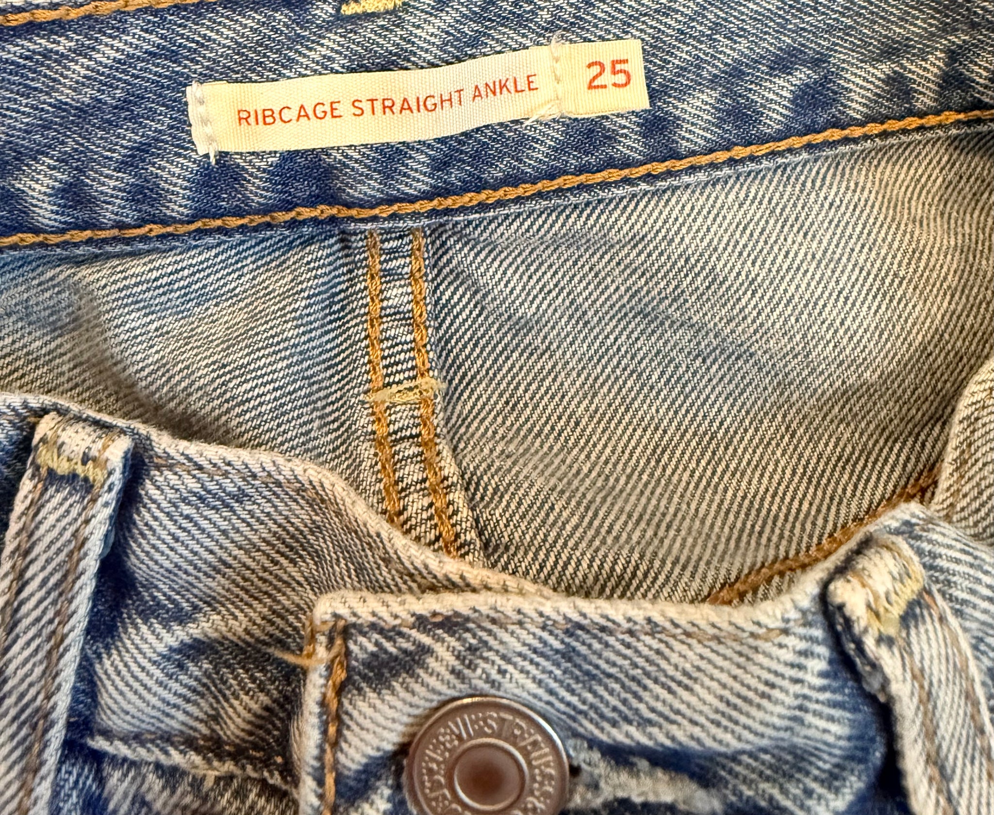 Levi’s women’s high rise Ribcage Straight leg jeans in distressed ripped denim with button fly closure, shadow dye on back pocket, and frayed hems, size 25.