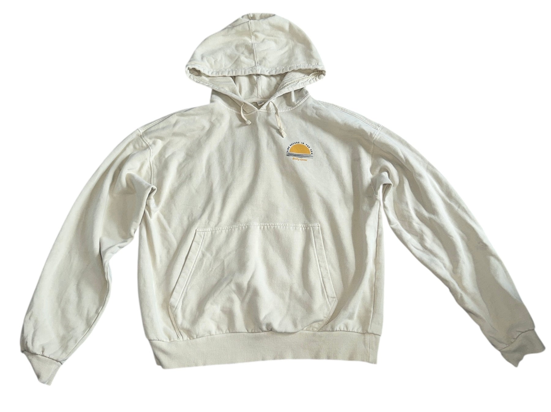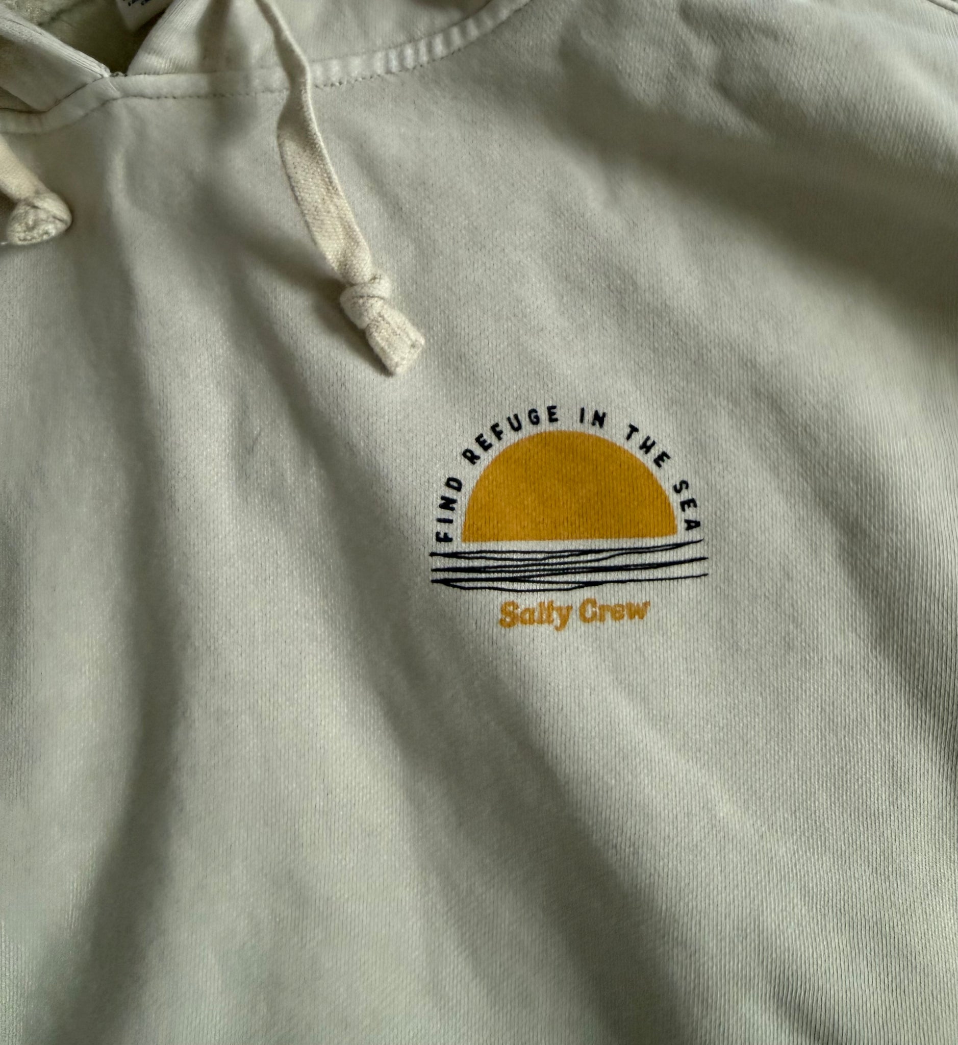 Salty Crew women’s heavyweight off white pullover hoodie with Take Refuge in the Sea graphic on chest and back, size S.