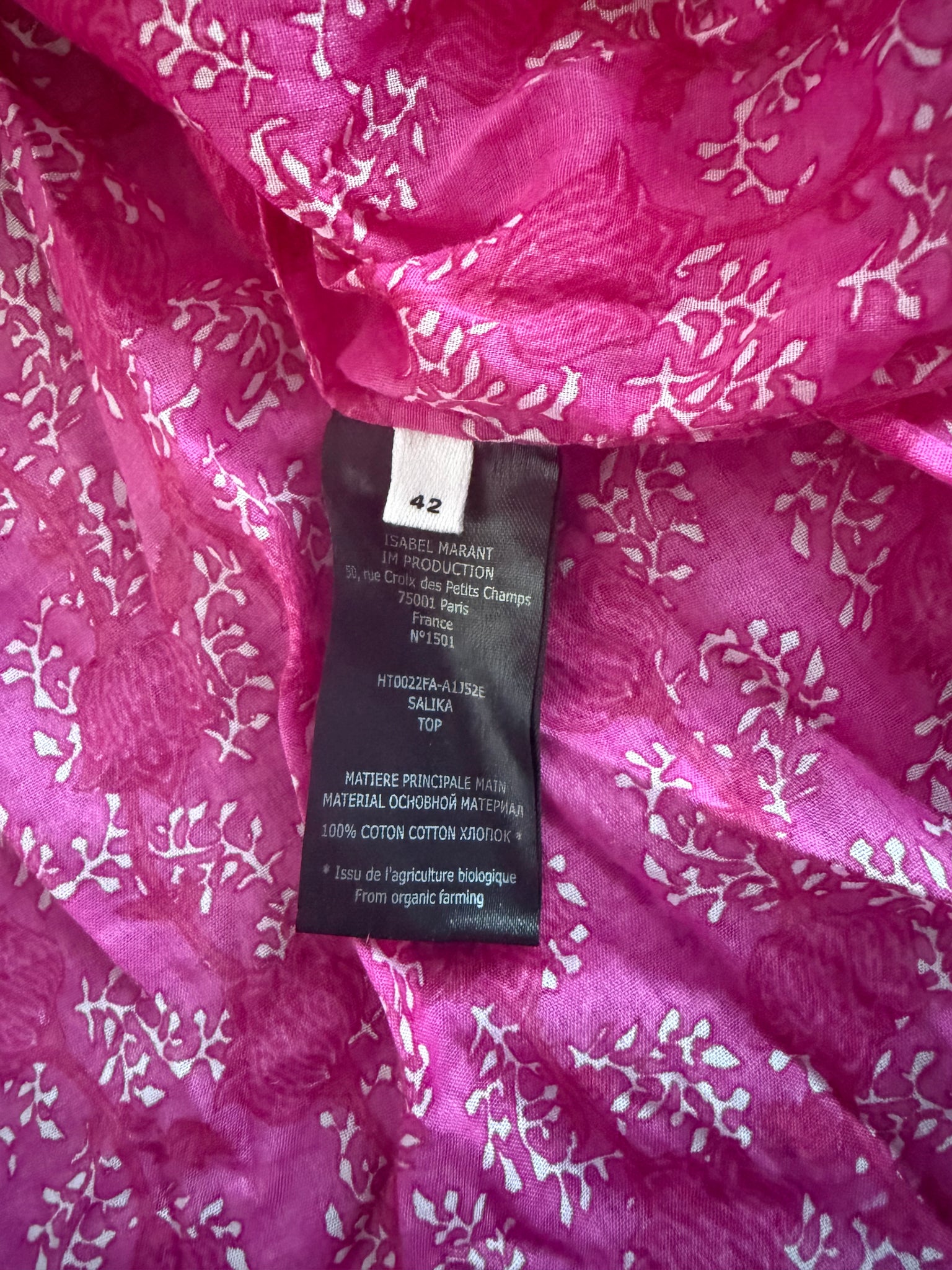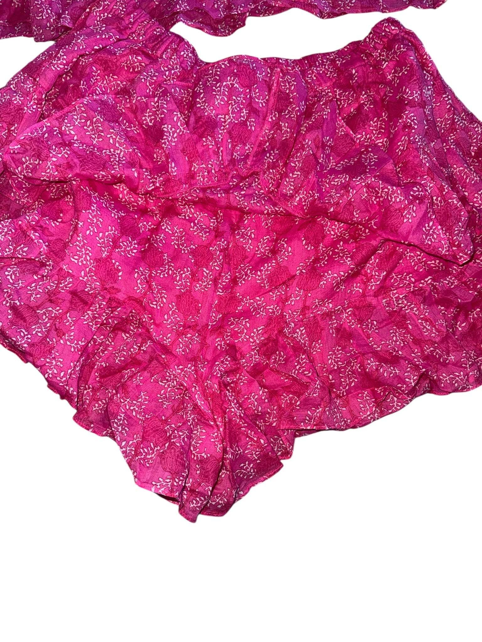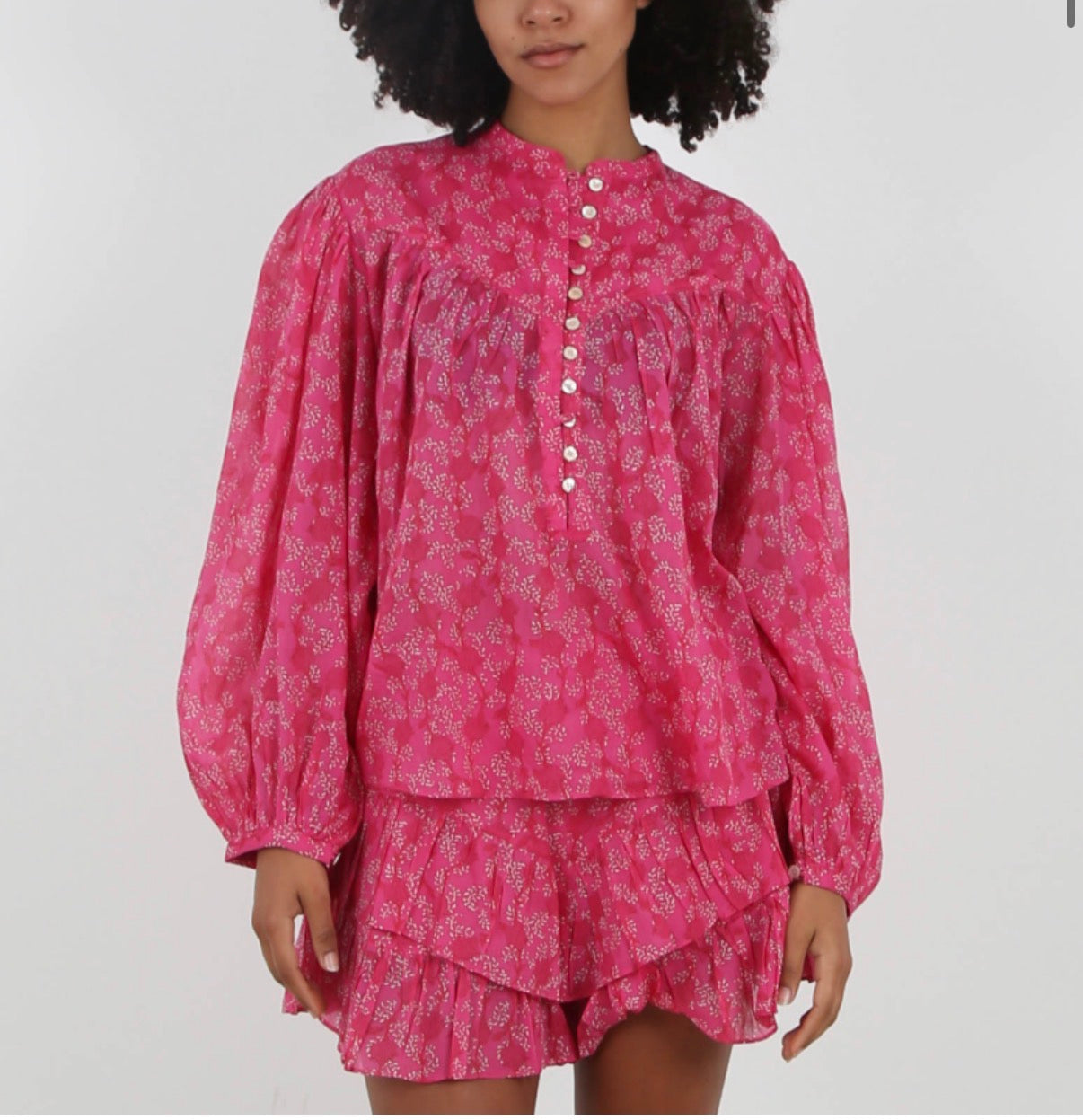 Isabel Marant women’s 2pc Etoile long sleeve Salika blouse set with buttons, and matching Jocadia ruffled mini skort (looks like skirt but it’s shorts) with elastic hem, in fuchsia with white floral print, size 42.