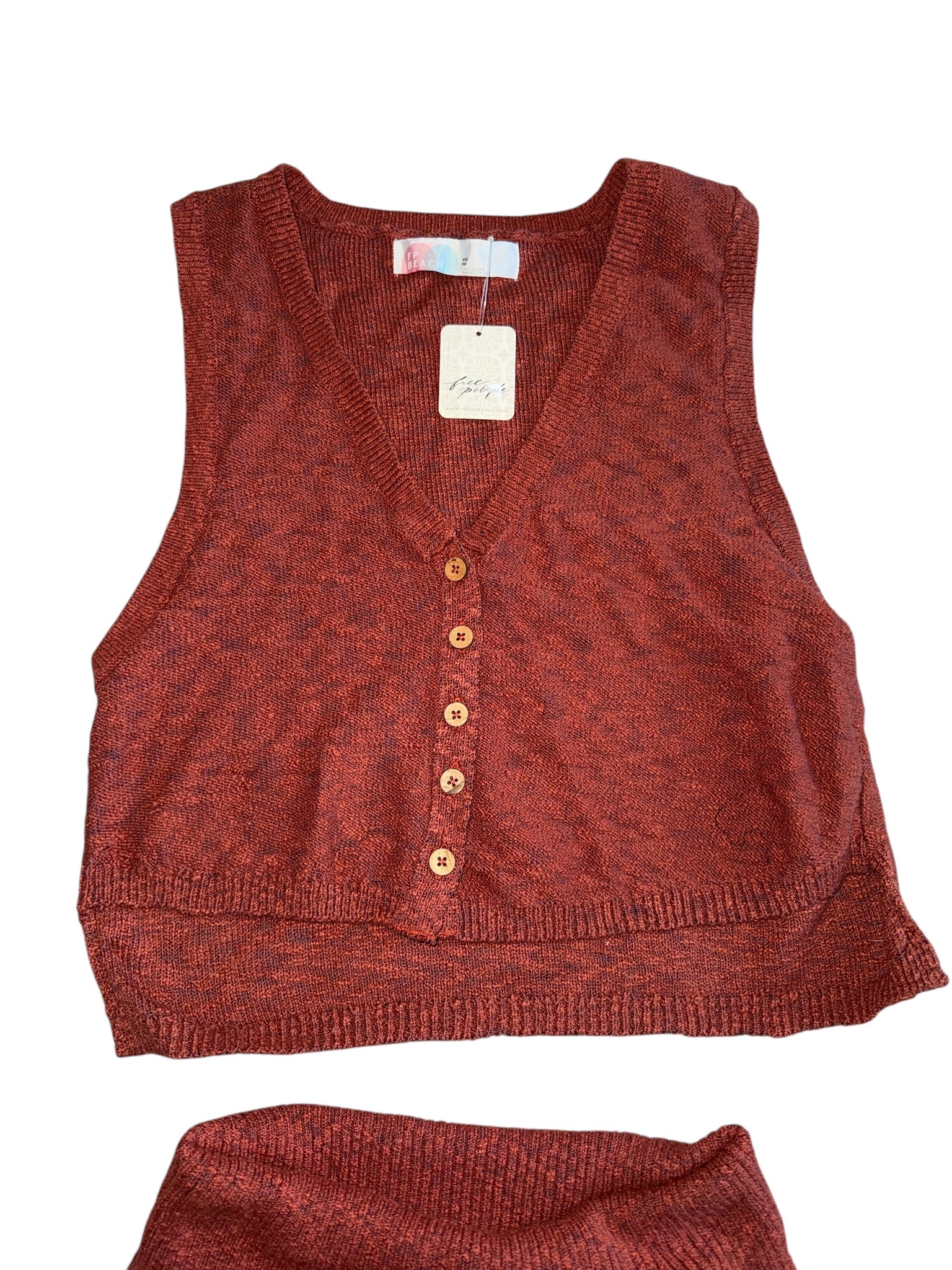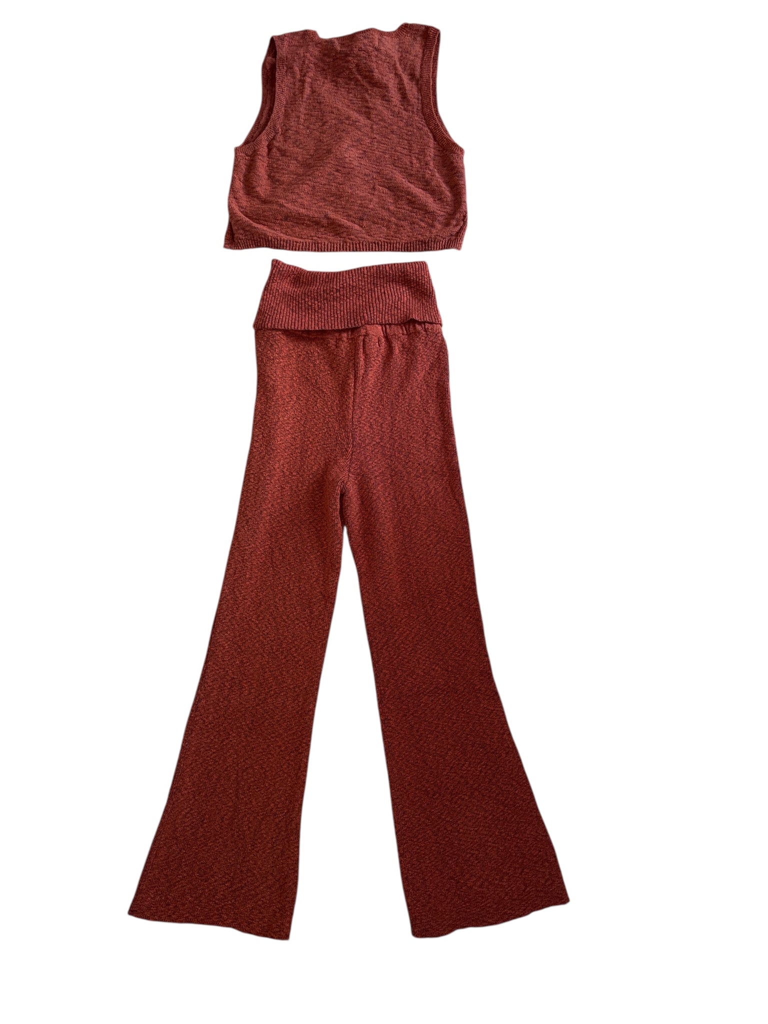 Free People Beach women’s 2pc Ruby sweater set with button up cropped tank, and matching foldover cropped flare pants set, size XS.