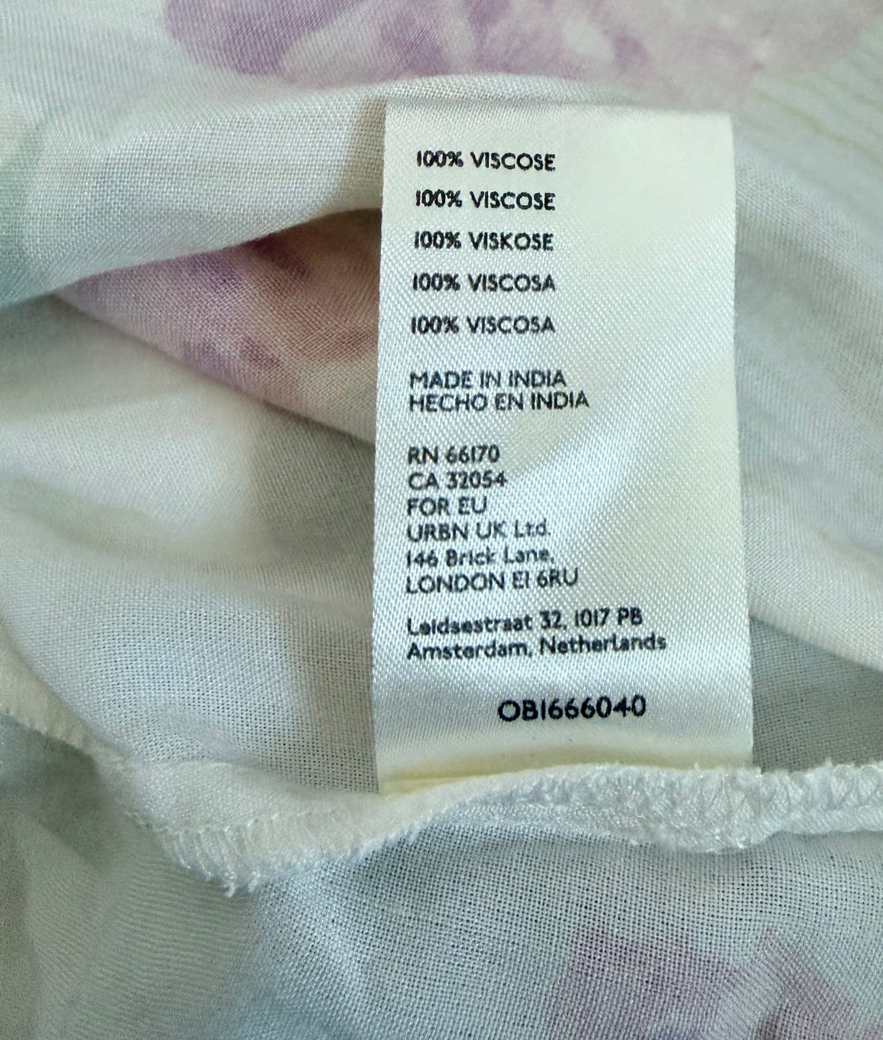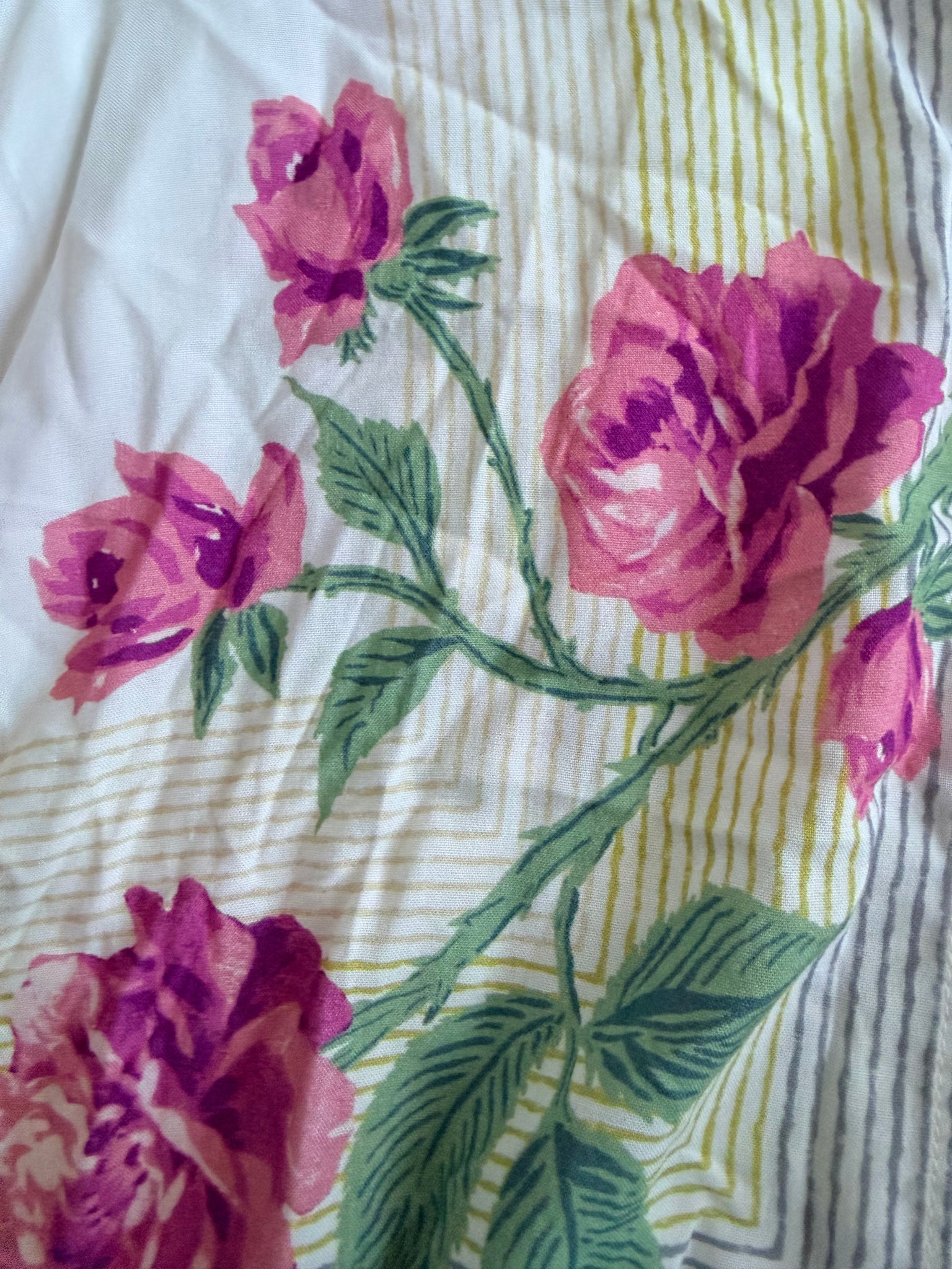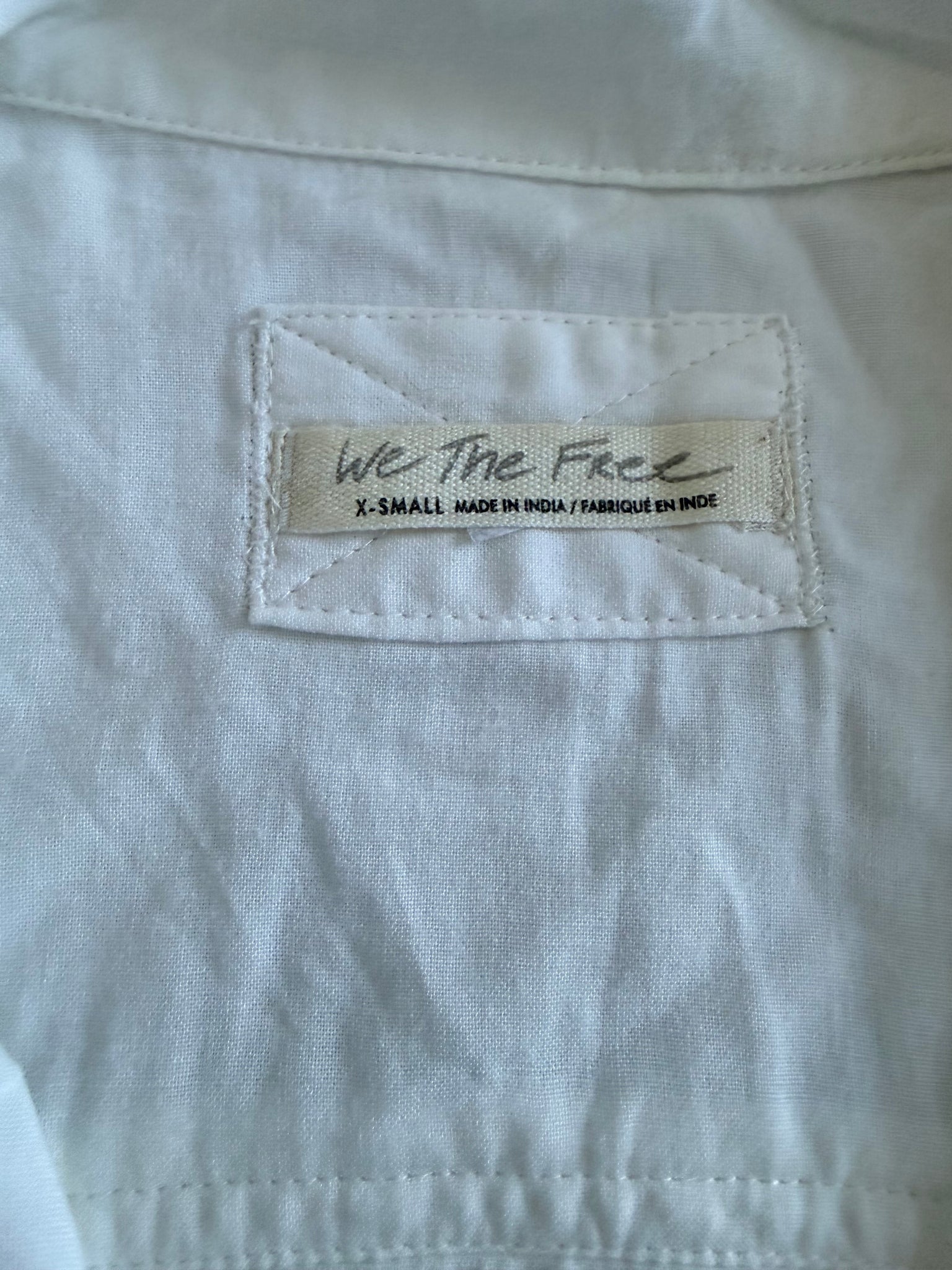 The Free x Free People women’s oversized, cropped, Big Blooms white button down collared blouse with printed flowers and stripe designs, size XS.