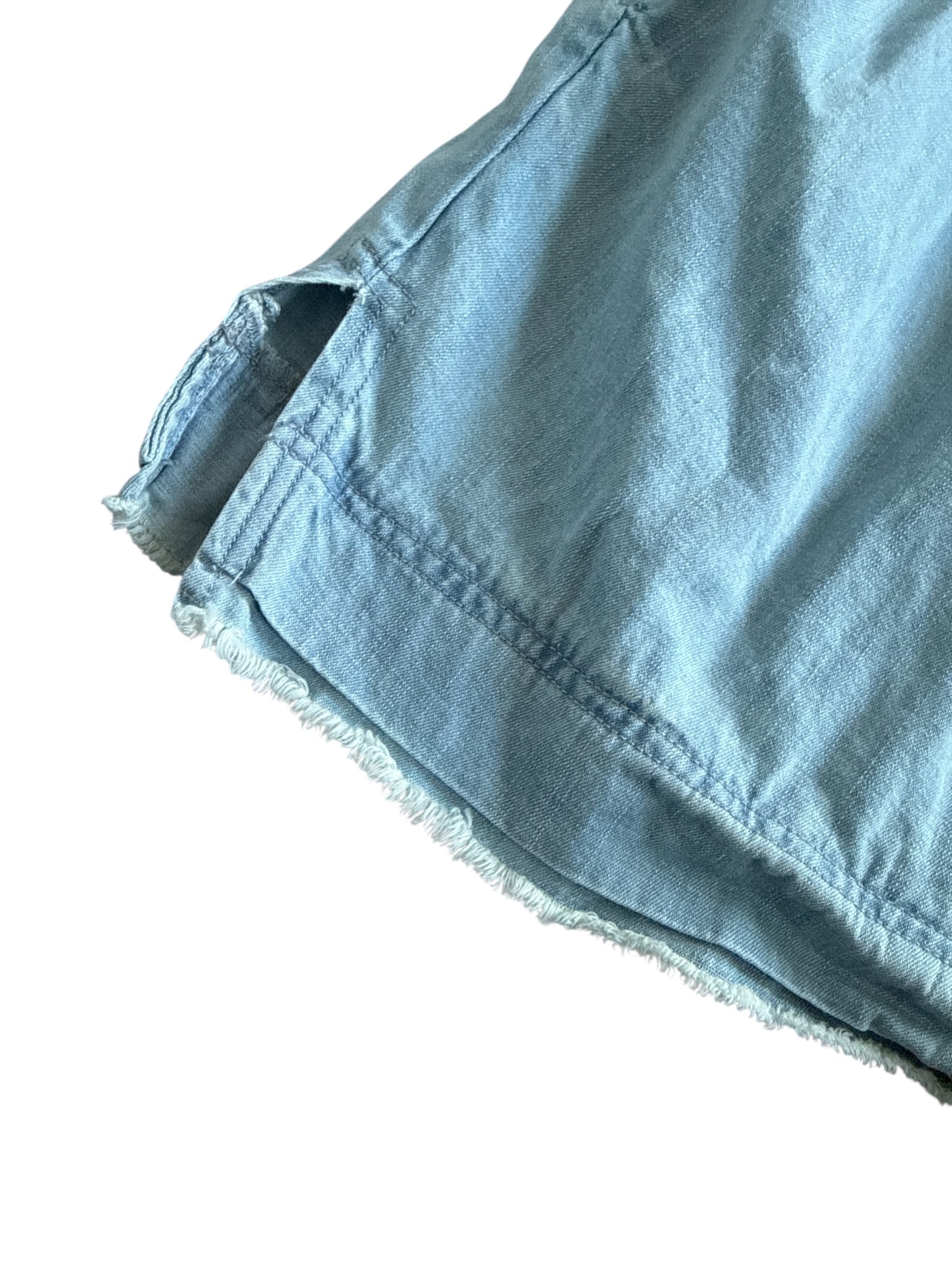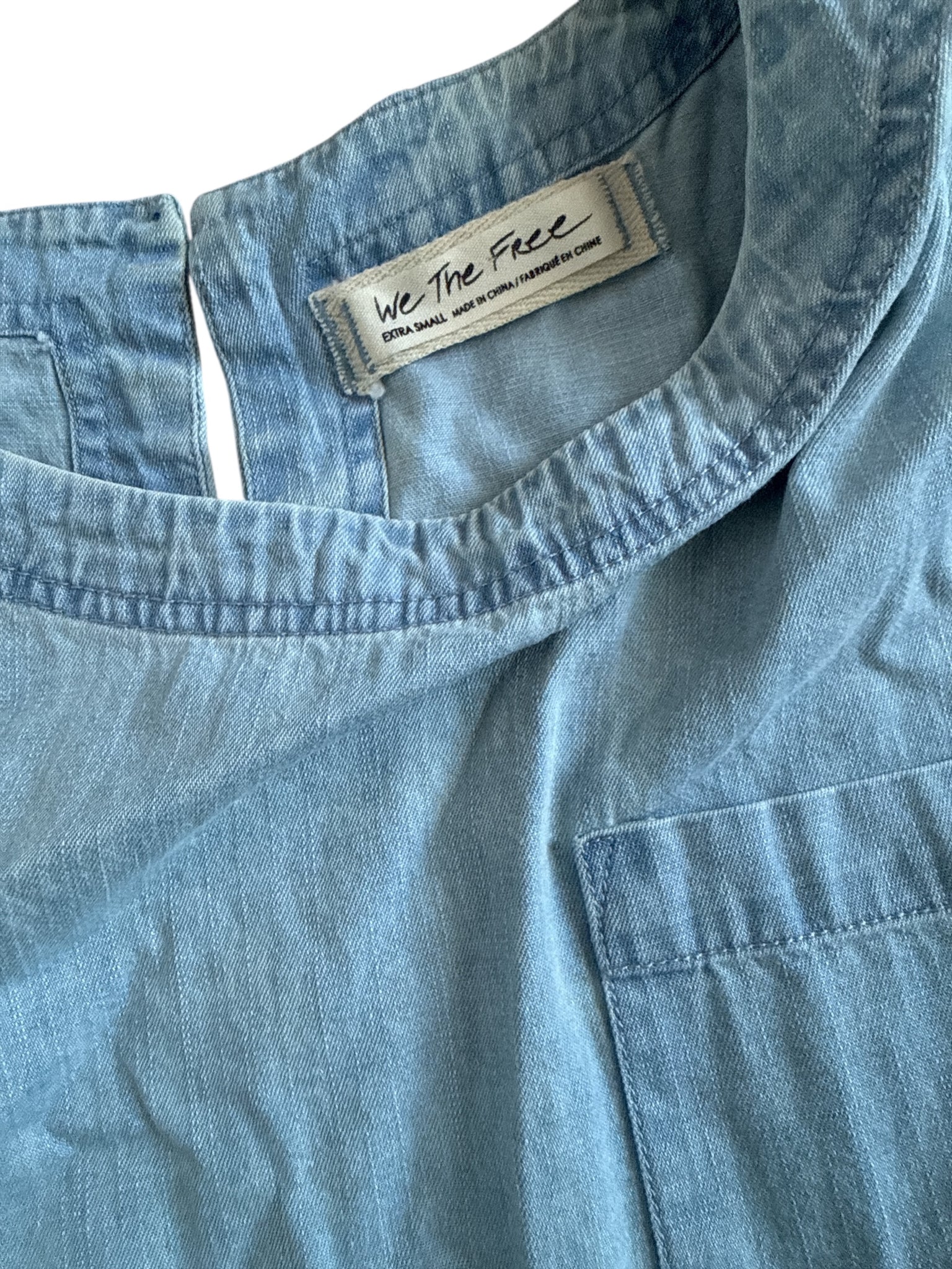 We The Free x Free People women’s Moon City light wash chambray denim short rolled sleeve oversized babydoll top with button and keyhole closure, pockets at sides, and frayed hem, size XS.