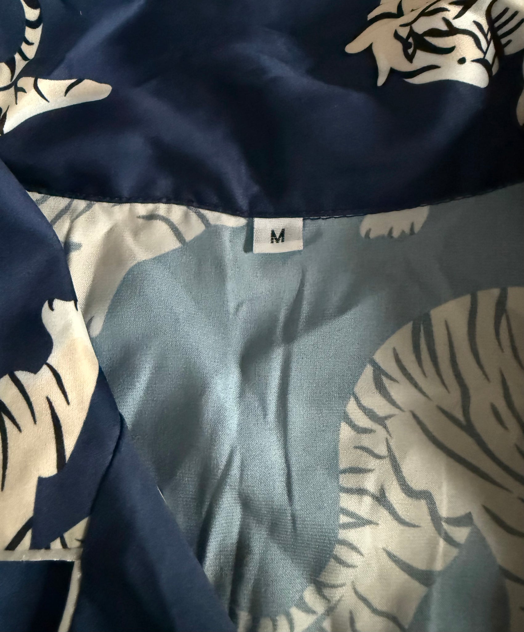 Women’s luxurious, silky satin deep navy blue pajama set with long sleeve button up top and cropped pants set in white tiger print with white piping, size M.