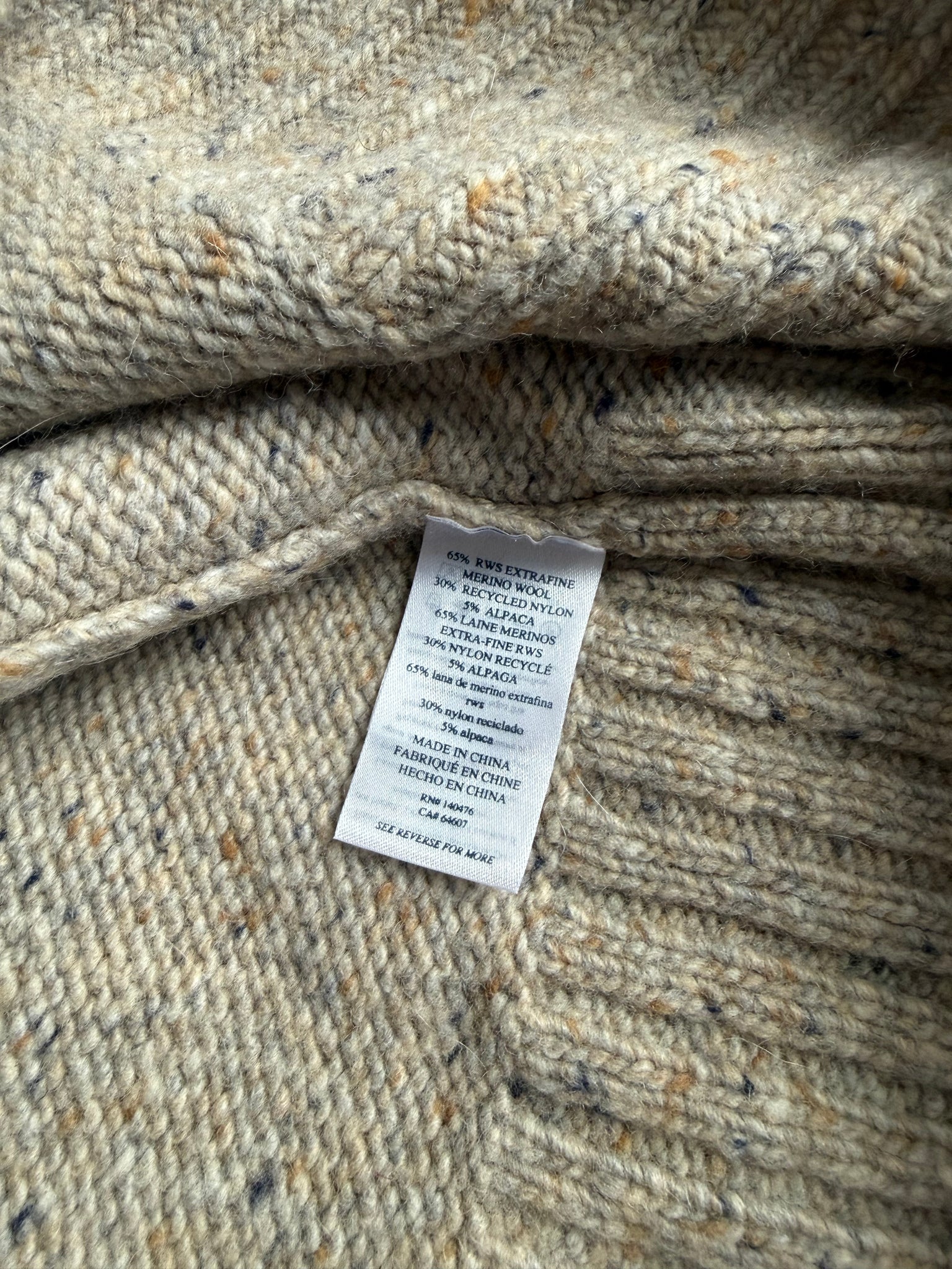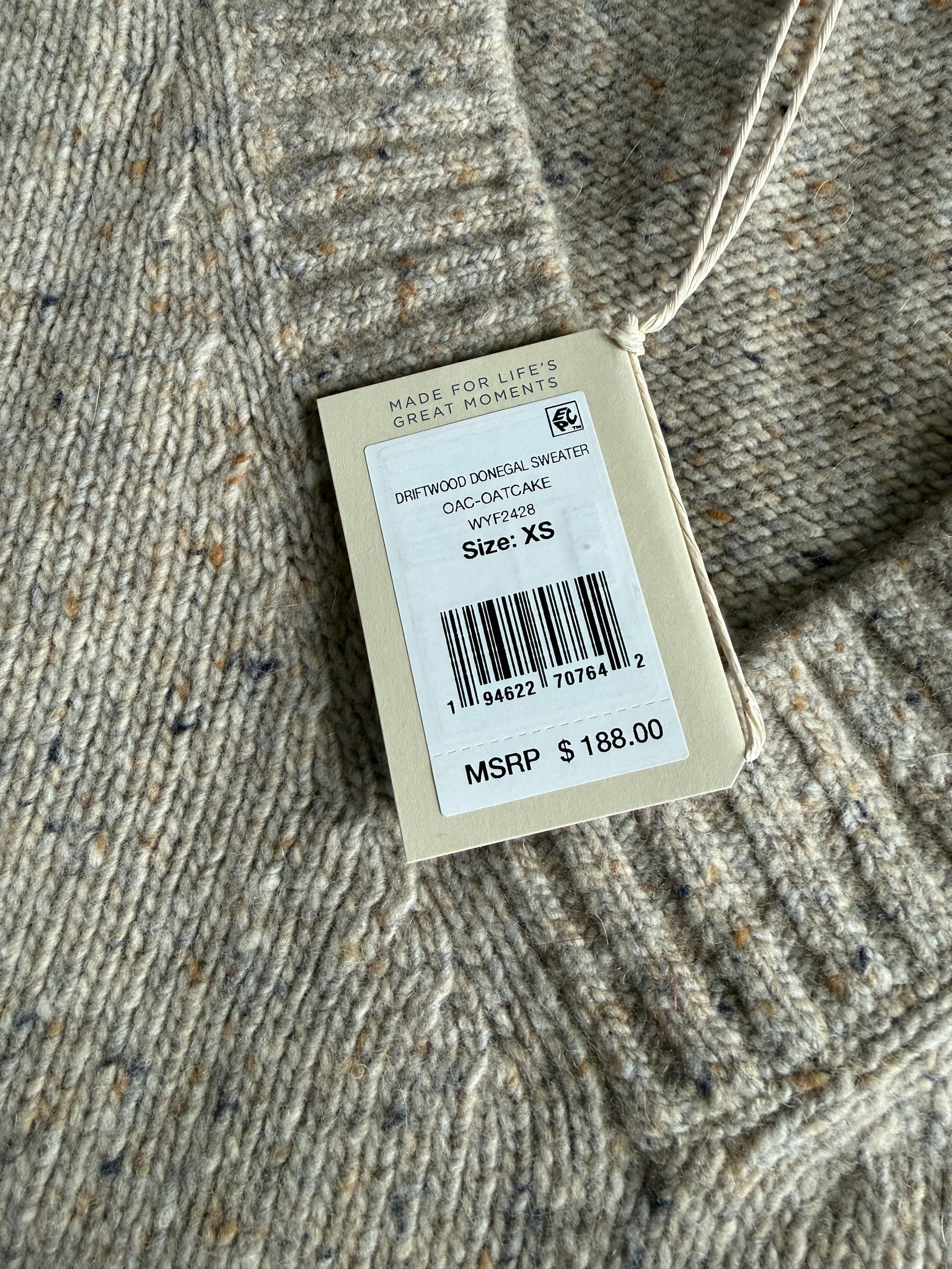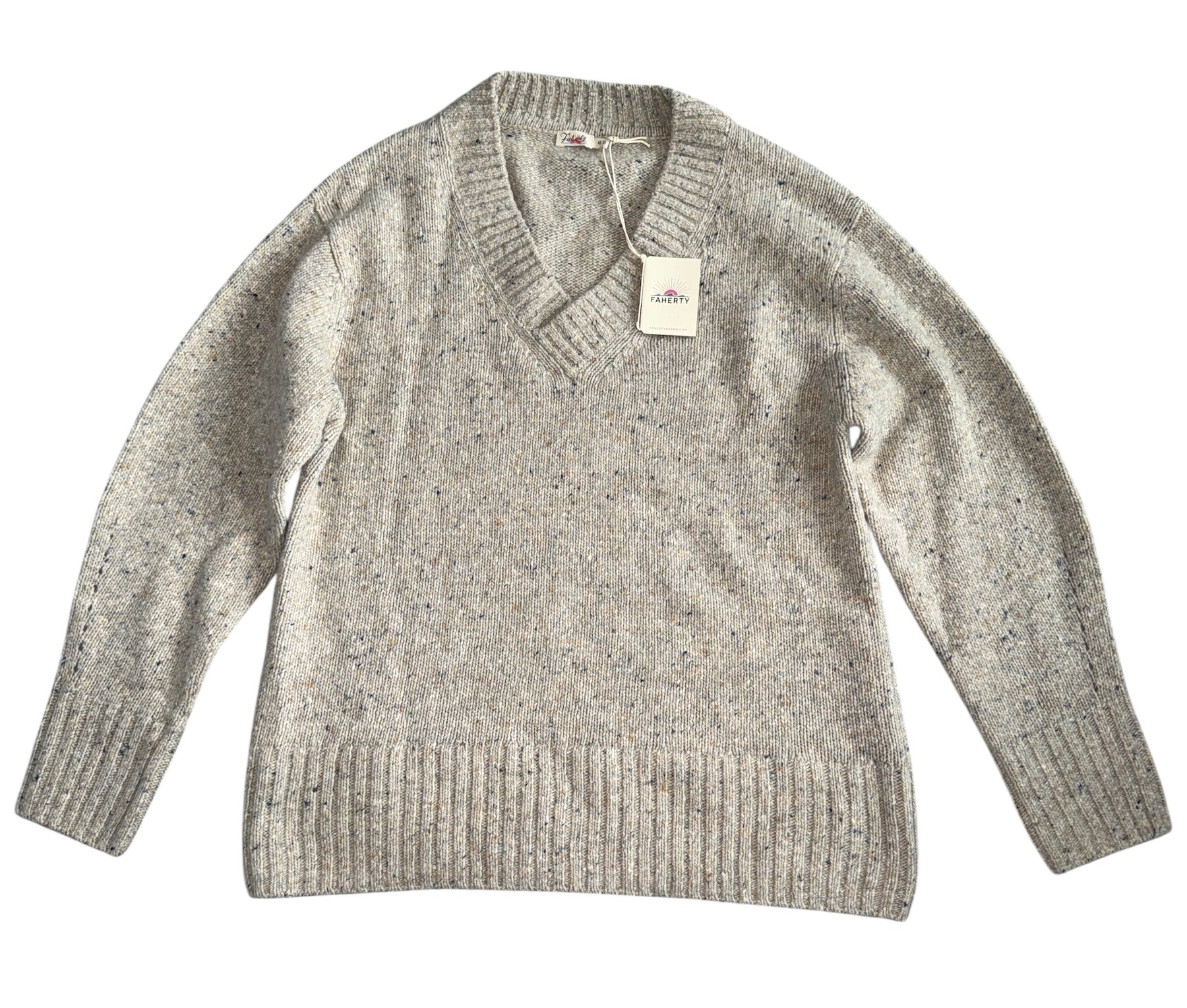 Faherty women’s Driftwood Donegal v-neck sweater in oatcake flecked beige knit, size XS.