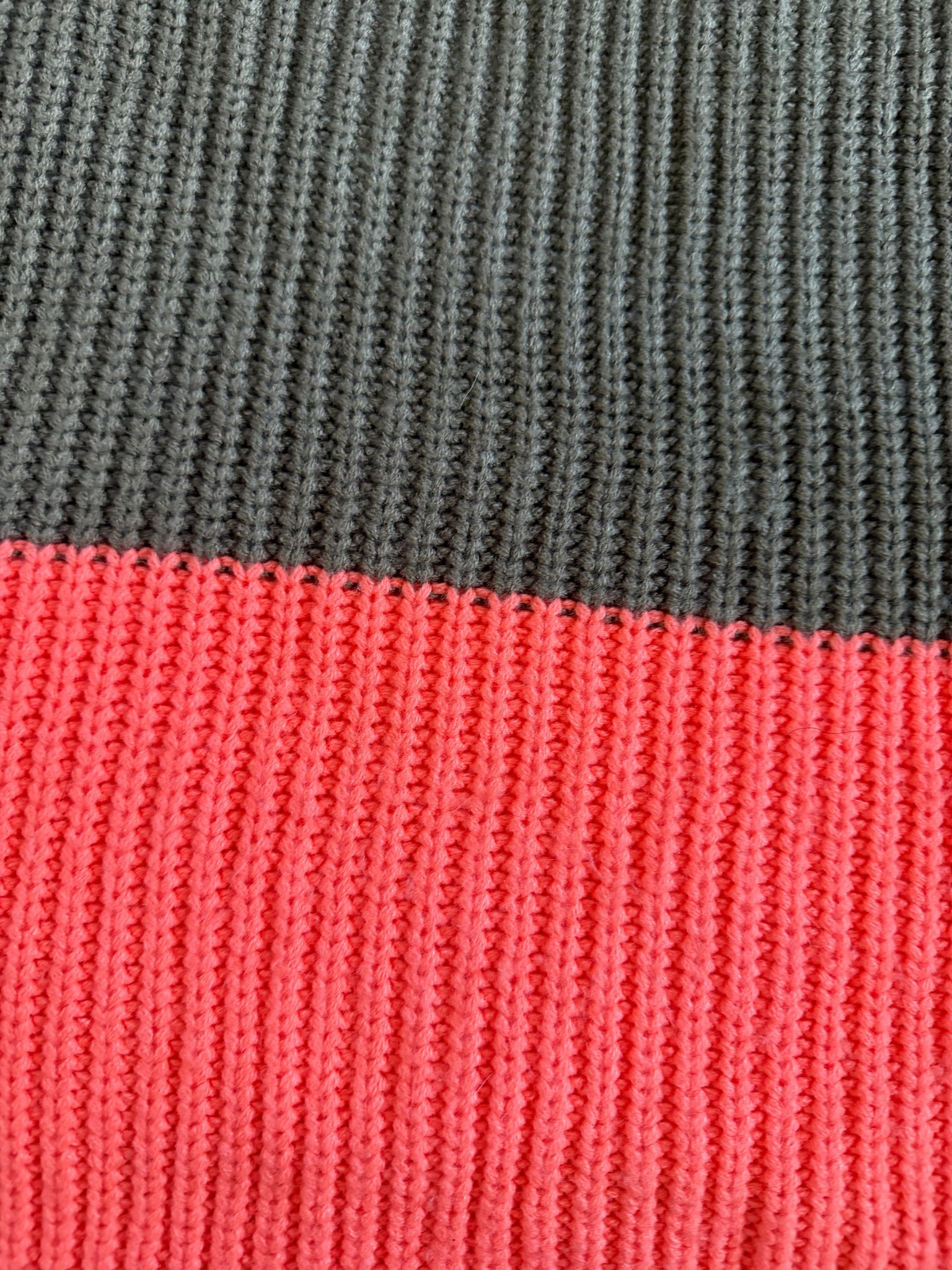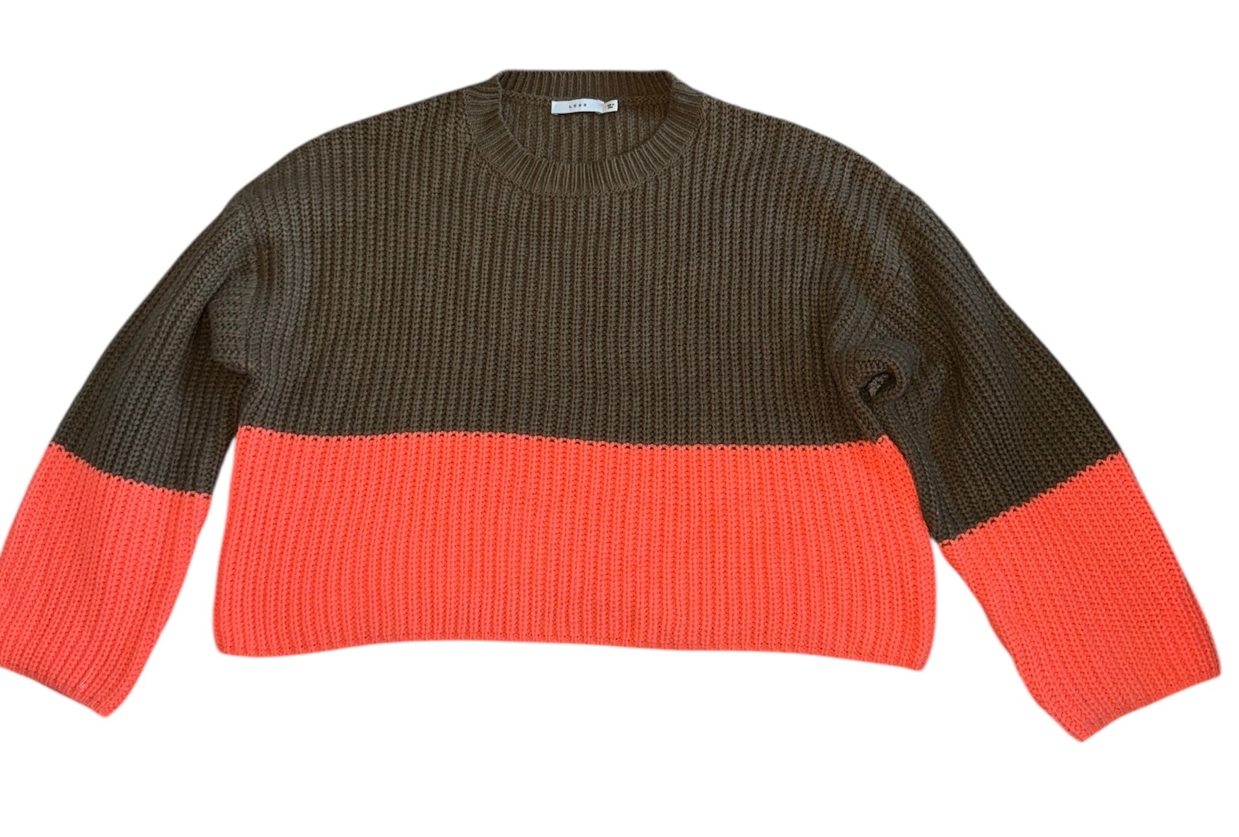 Lush women’s soft rubber knit boxy sweater in brown and neon coral color block size S.